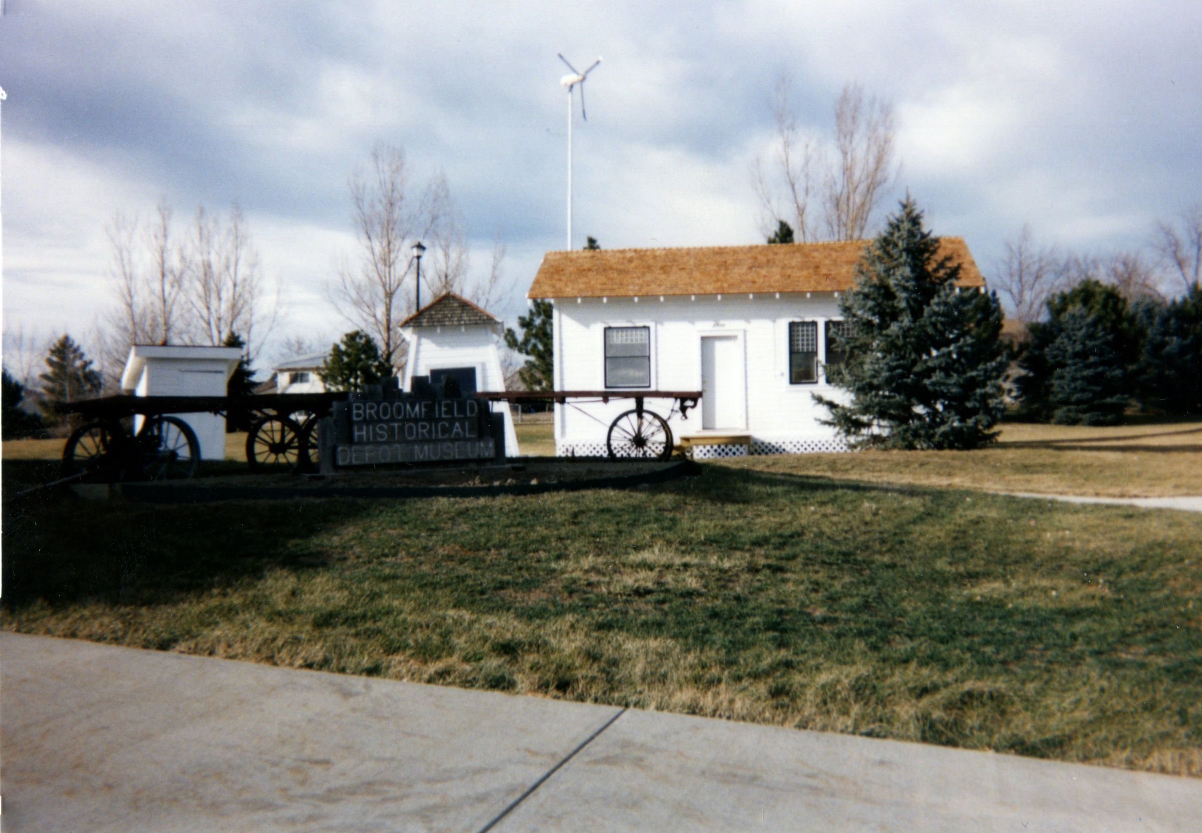 Photo of Honey House, Pump House, Outhouse at Zang Spur Park. Two railroad luggage carts. Sign "Broomfield Historical Depot Museum".