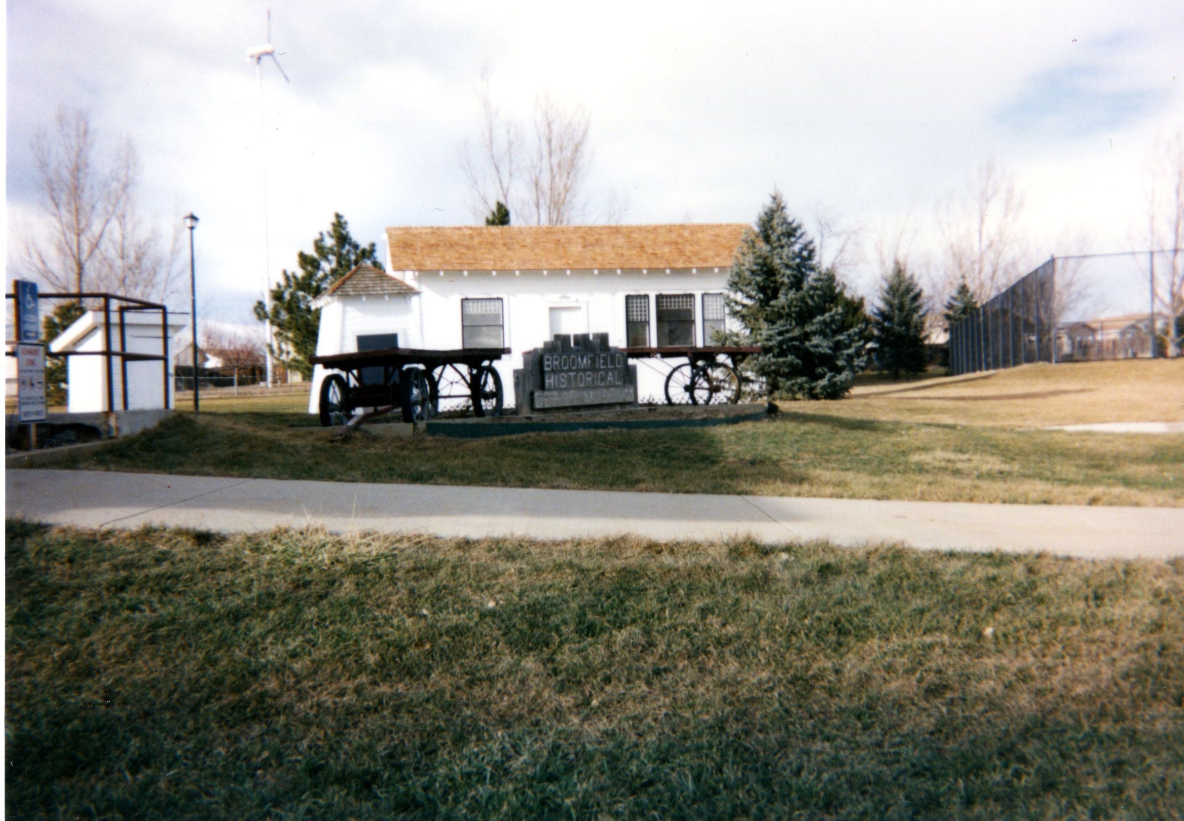 Photo of Honey House, Pump House and Outhouse at Zang Spur Park. Two railroad luggage carts. Sign "Broomfield Historical Depot Museum".