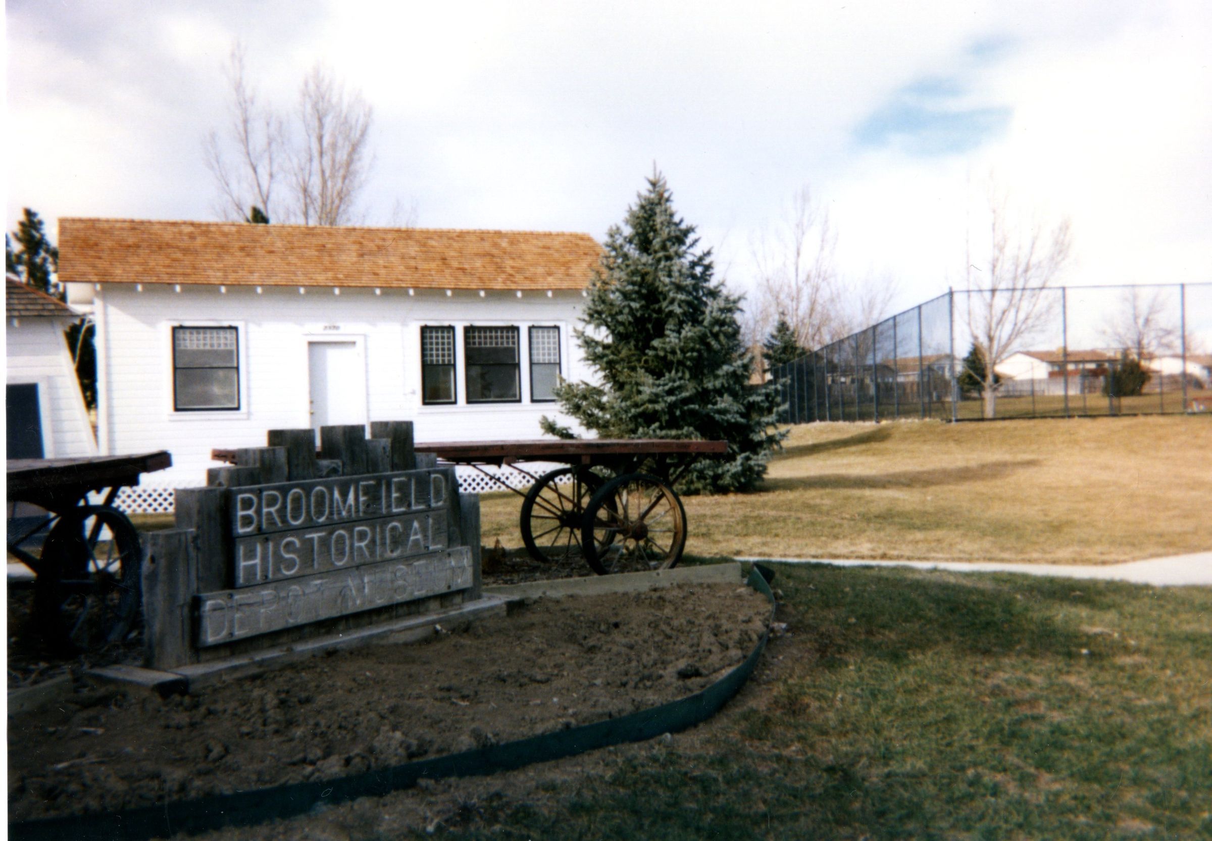 Photo of Honey House and Pump House at Zang Spur Park. Two railroad luggage carts. Sign" Broomfield Historical Depot Museum".