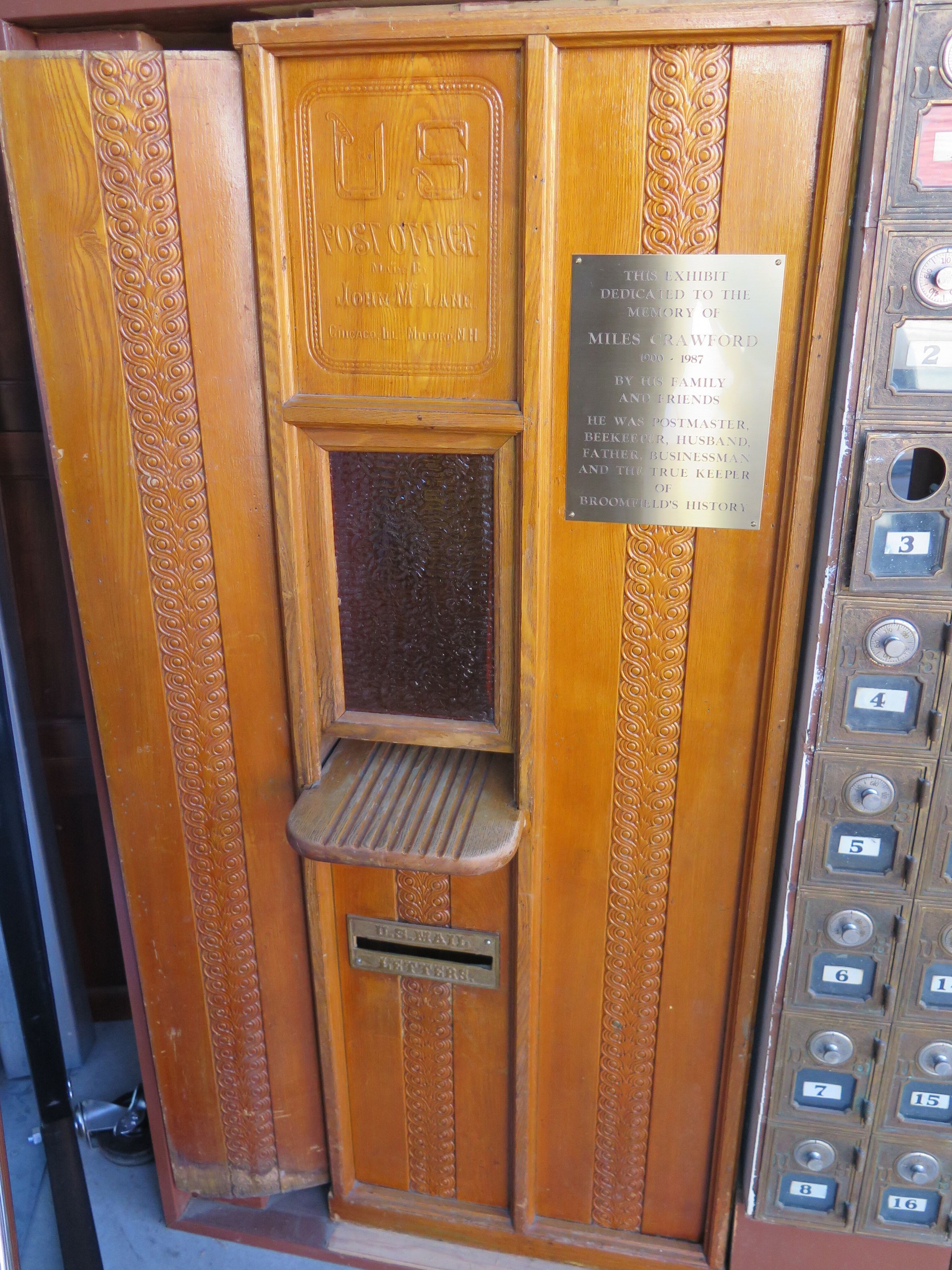 A plaque on the display reads, "This exhibit dedicated to the memory of Miles Crawford 1900-1987 by his family and friends. He was postmaster, beekeeper, husband, father, businessman, and the true keeper of Broomfield's history".