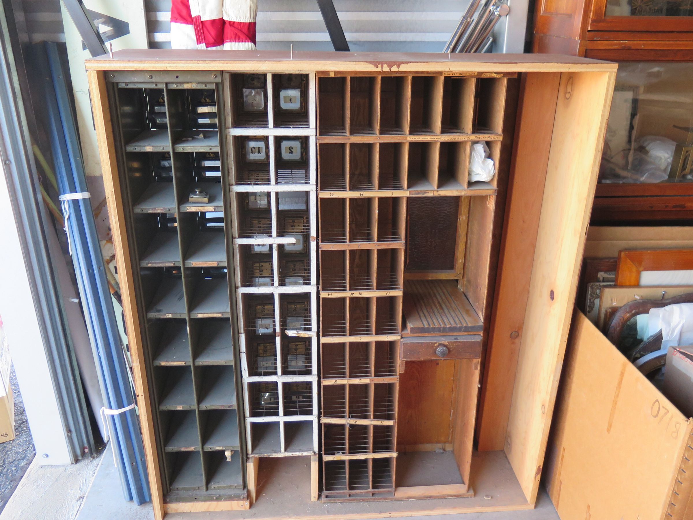 This is a wood and glass post office window from Jones Hall. The window has been attached to post office boxes and a mail slot to make a display.