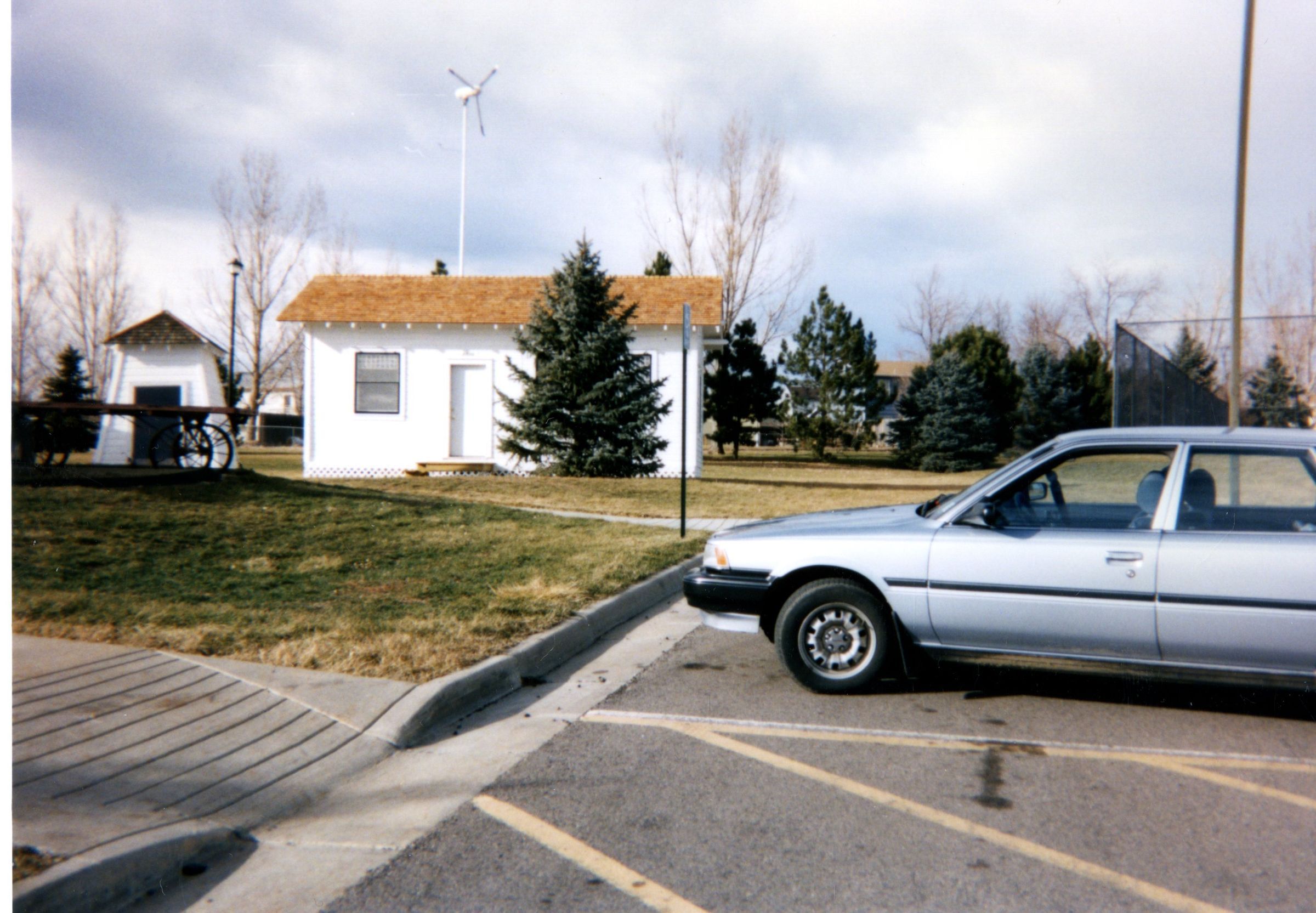 Photo from parking lot of Honey House and Pump House at Zang Spur Park. Railroad luggage cart.