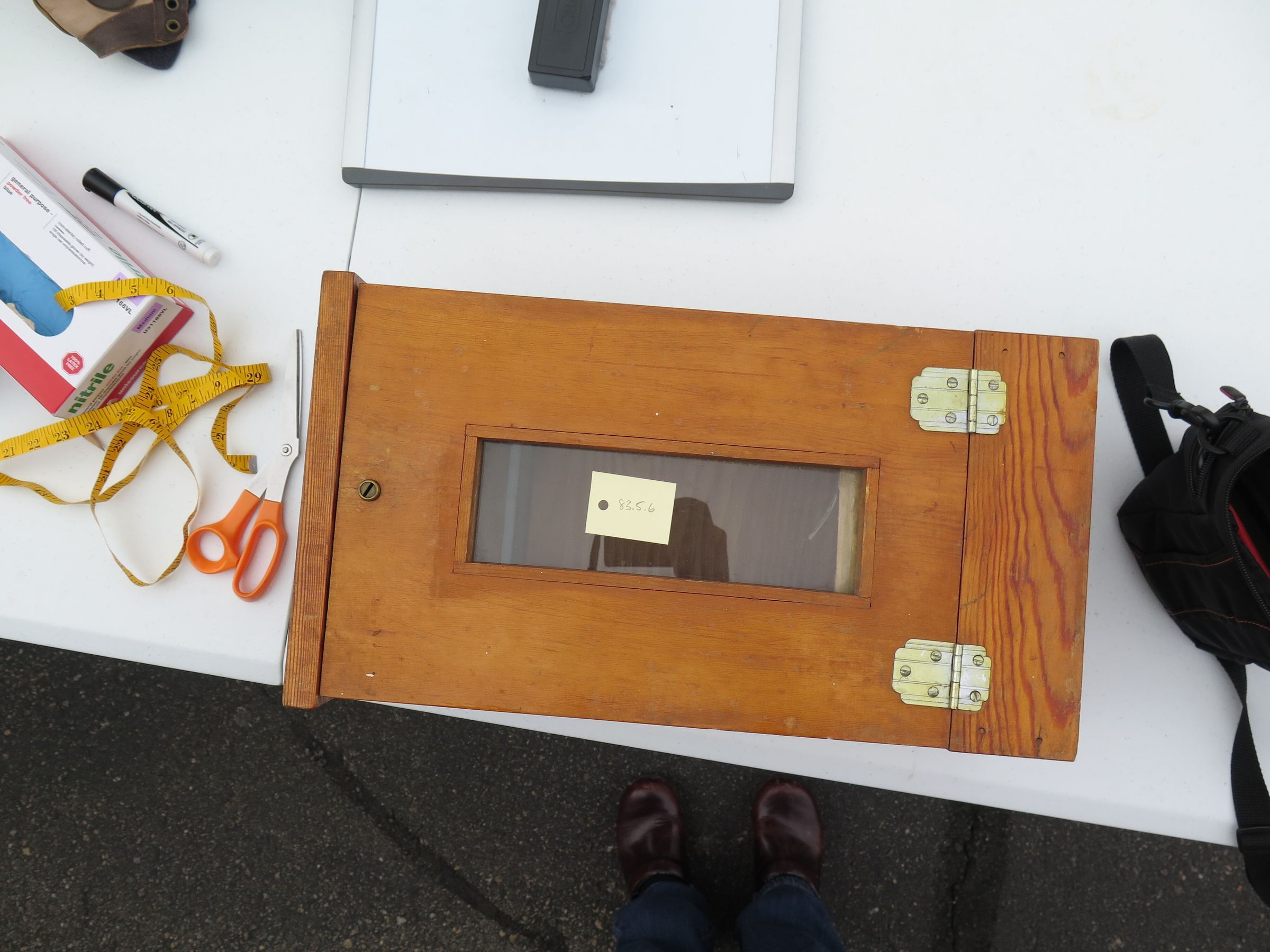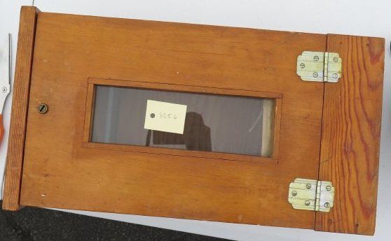 This is a postal deposit box for outside Blain Electric Bldg. The box is wood with a clear window on the front of the door and 2 hinges on the side of the door.The box measures 18.75" (h) x 10.5" (w) x 6.5" (d).