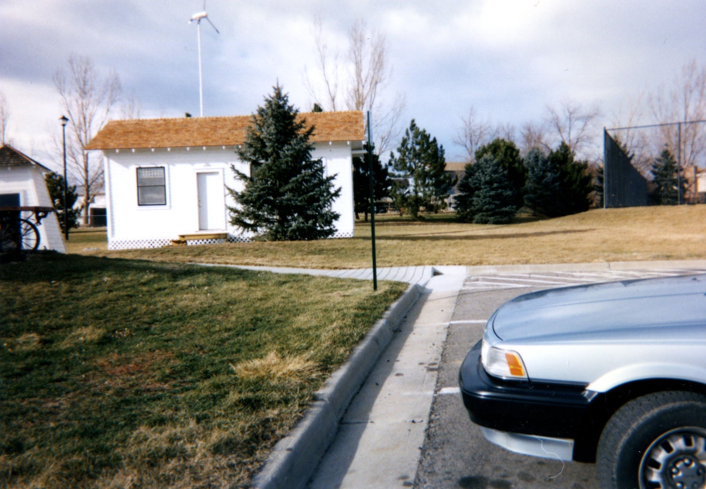 Photo of Honey House and Pump House at Zang Spur Park from parking lot. Tennis courts in background.