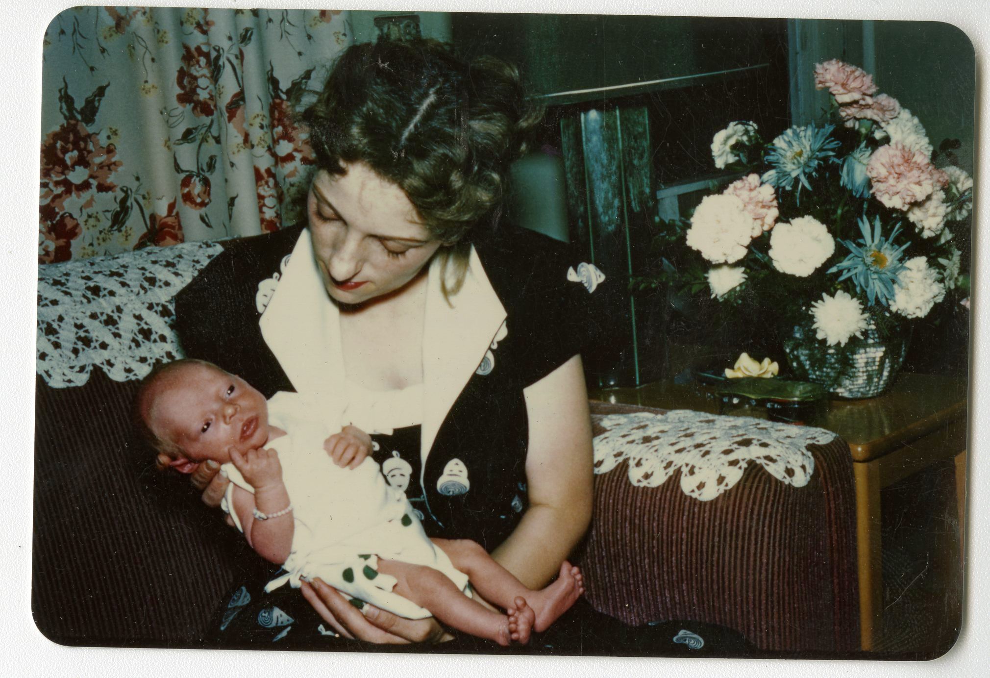 Color photograph of a woman and a baby. The woman is probably a wife of one of the Brunners. Photograph was printed the week of July 7, 1952