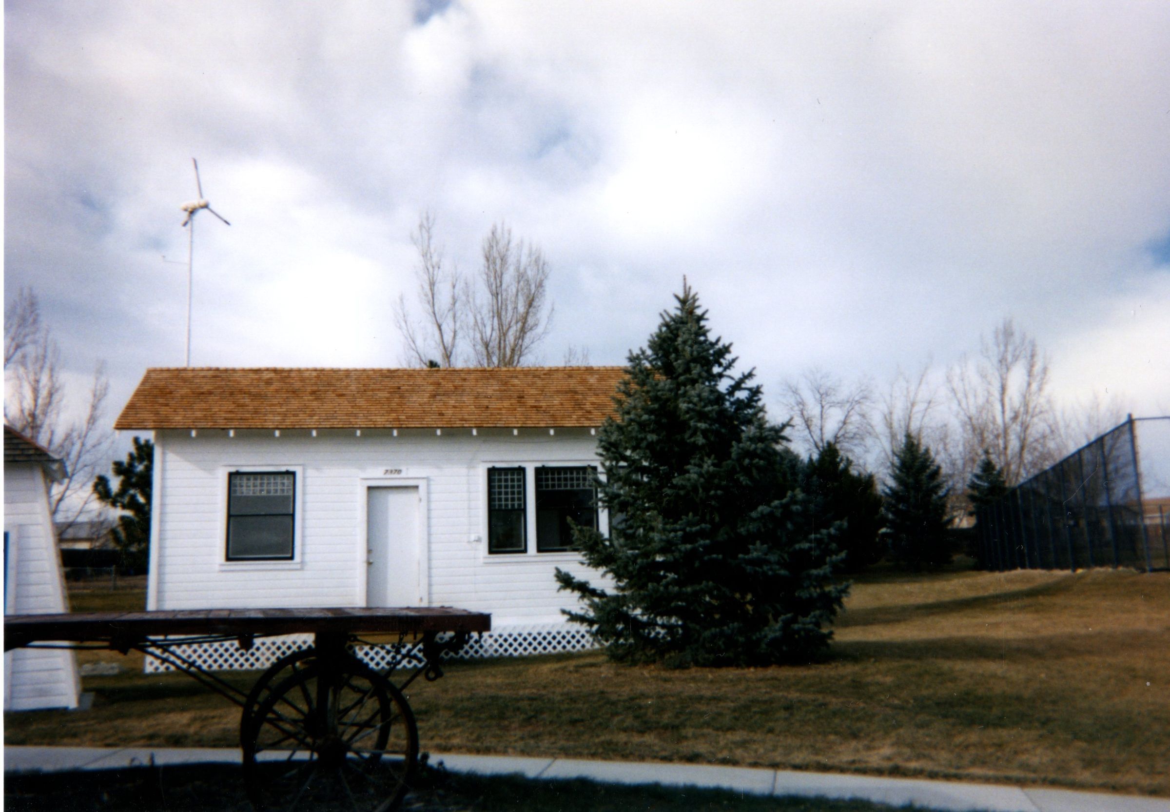 Photo of Honey House at Zang Spur Park. Pump House and railroad luggage cart.