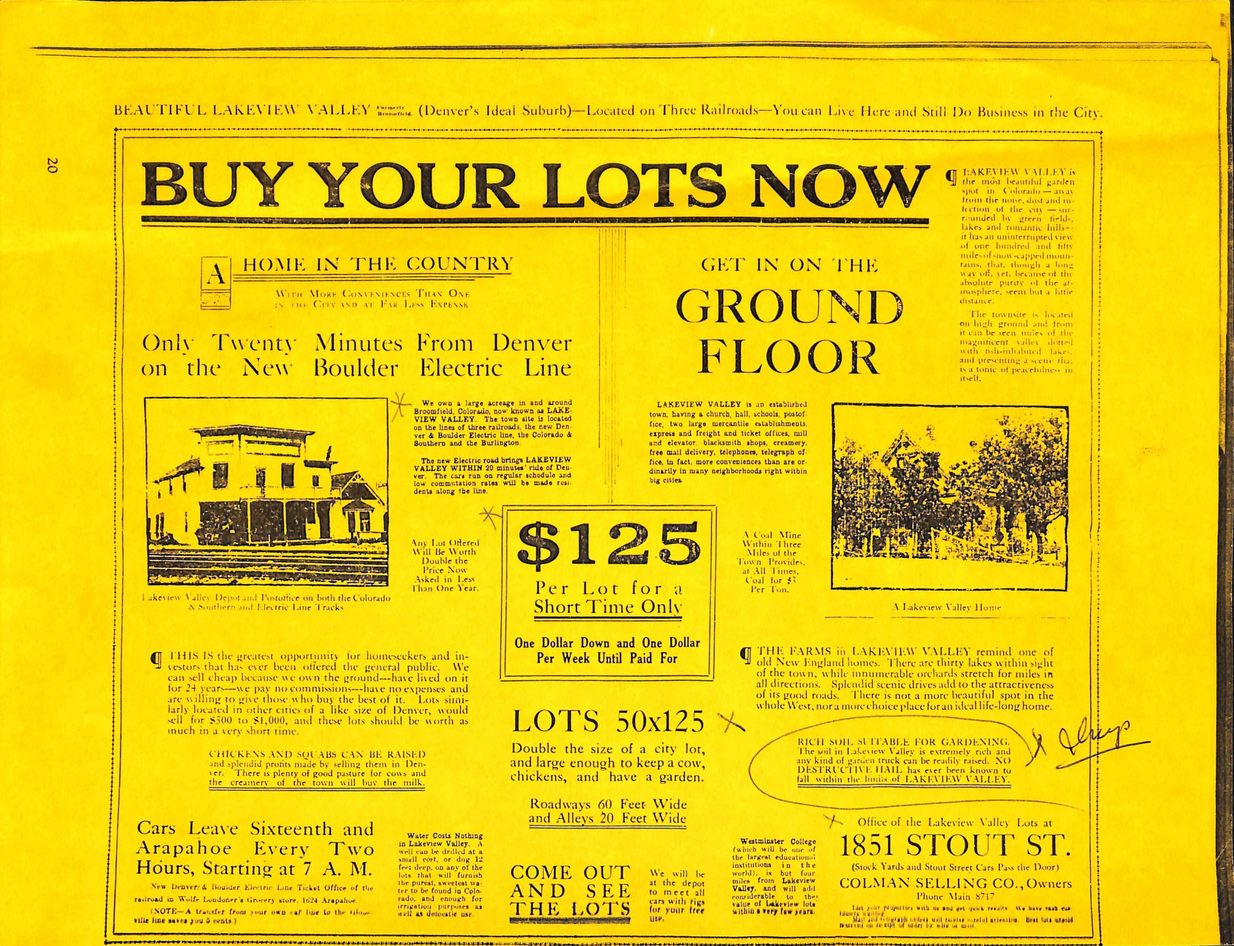 This is an advertisement for the Colman Selling Co. In this advertisement it is believed that he is advertising a suburb lot in Lakeview due to the top in small print saying "BEAUTIFUL LAKEVIEW VALLEY Formerly Broomfield (Denver's Ideal Suburb)-- You can Live here and Still do Business in the City". Each lot is being sold for $125 for a limited time. The lots come in the size 50x125 and the size is advertised as "Double the size of a city lot, and large enough to keep a cow, chickens, and have a garden".