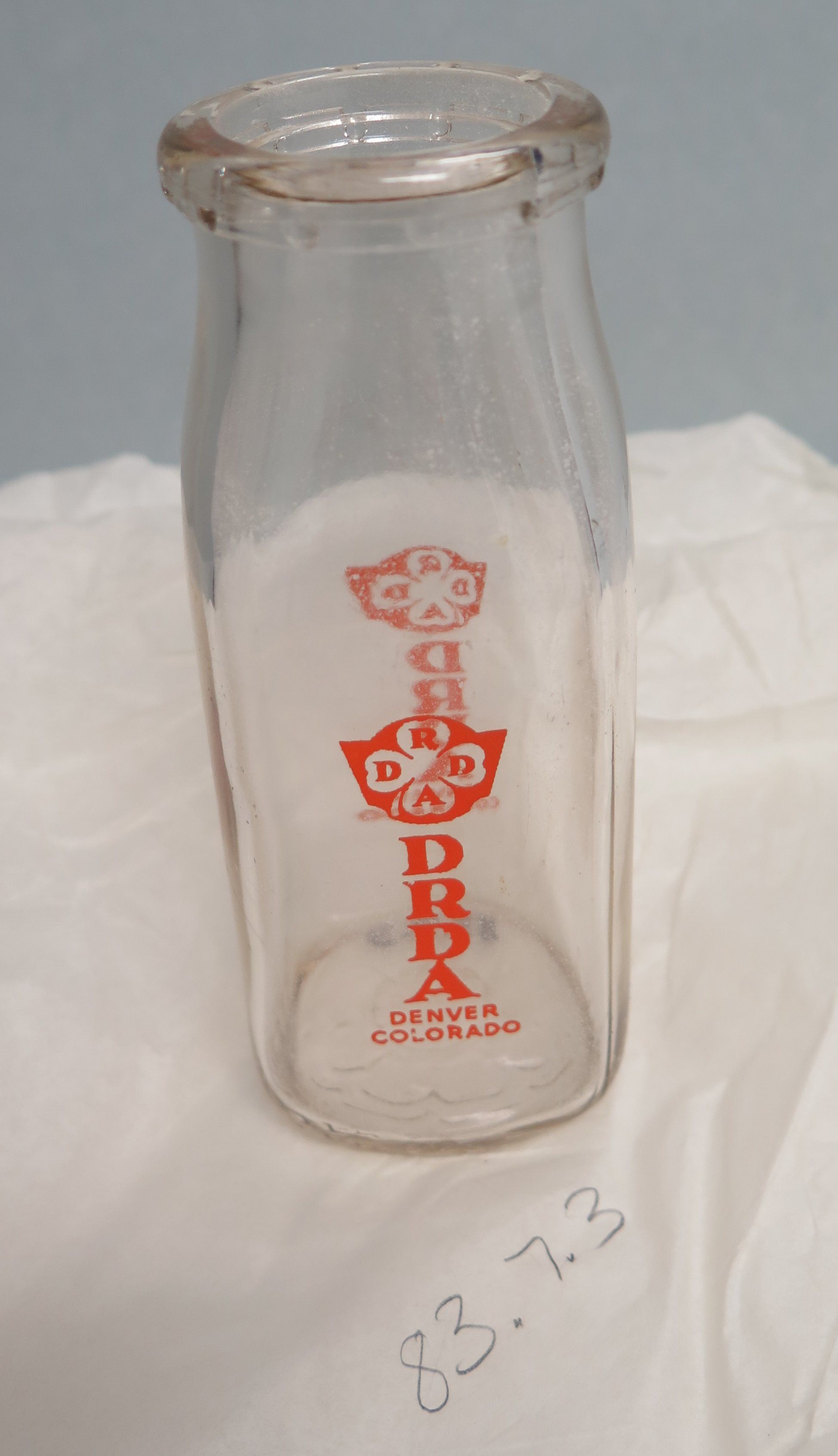 This is a clear glass milk bottle with a square base and a round opening at the top. The milk bottle has red text on the side that reads, "DRDA/ Denver/ Colorado". Also on the side is the clover logo for DRDA. The milk bottle measures 5.5" (h) x 2" (w) x 2" (l).