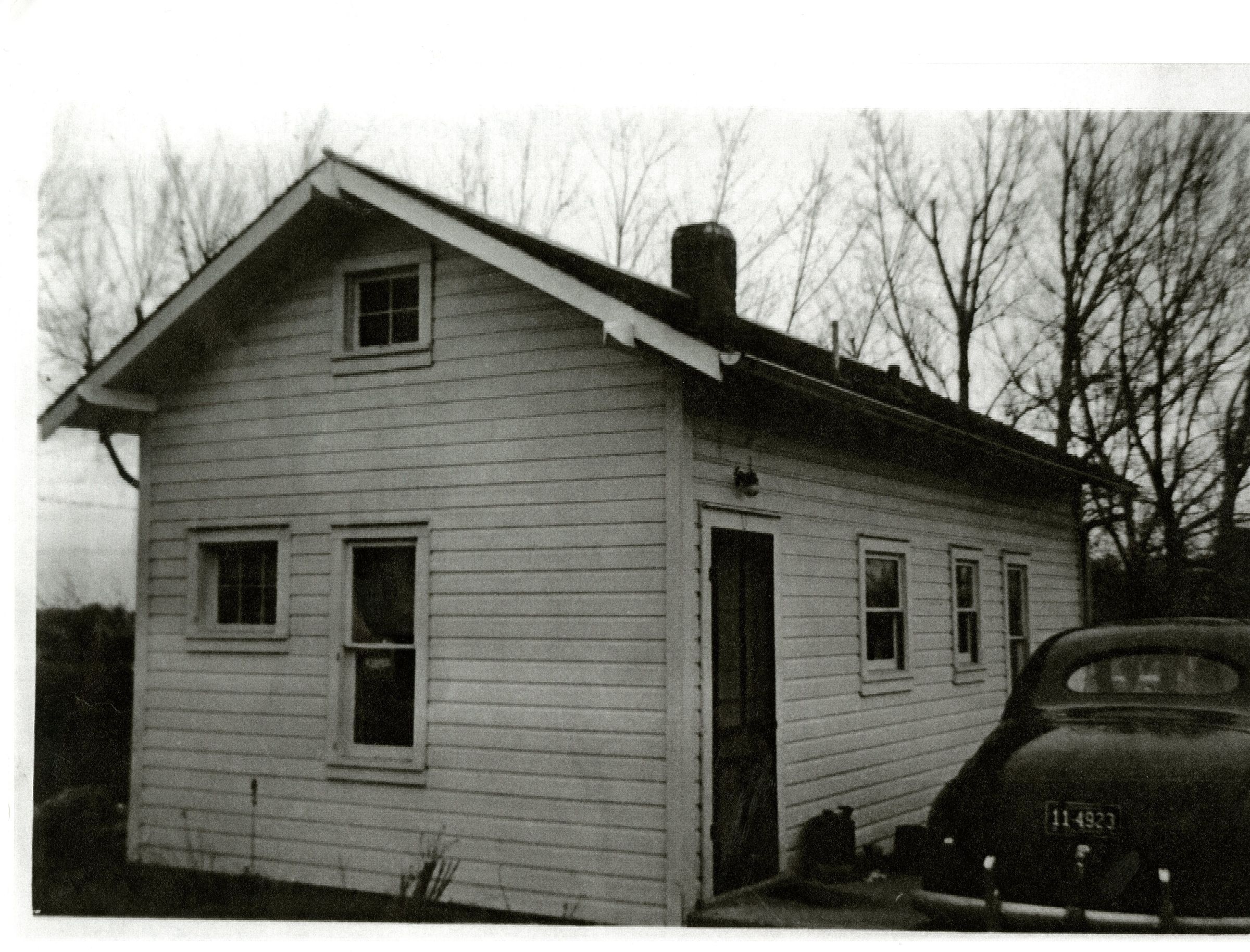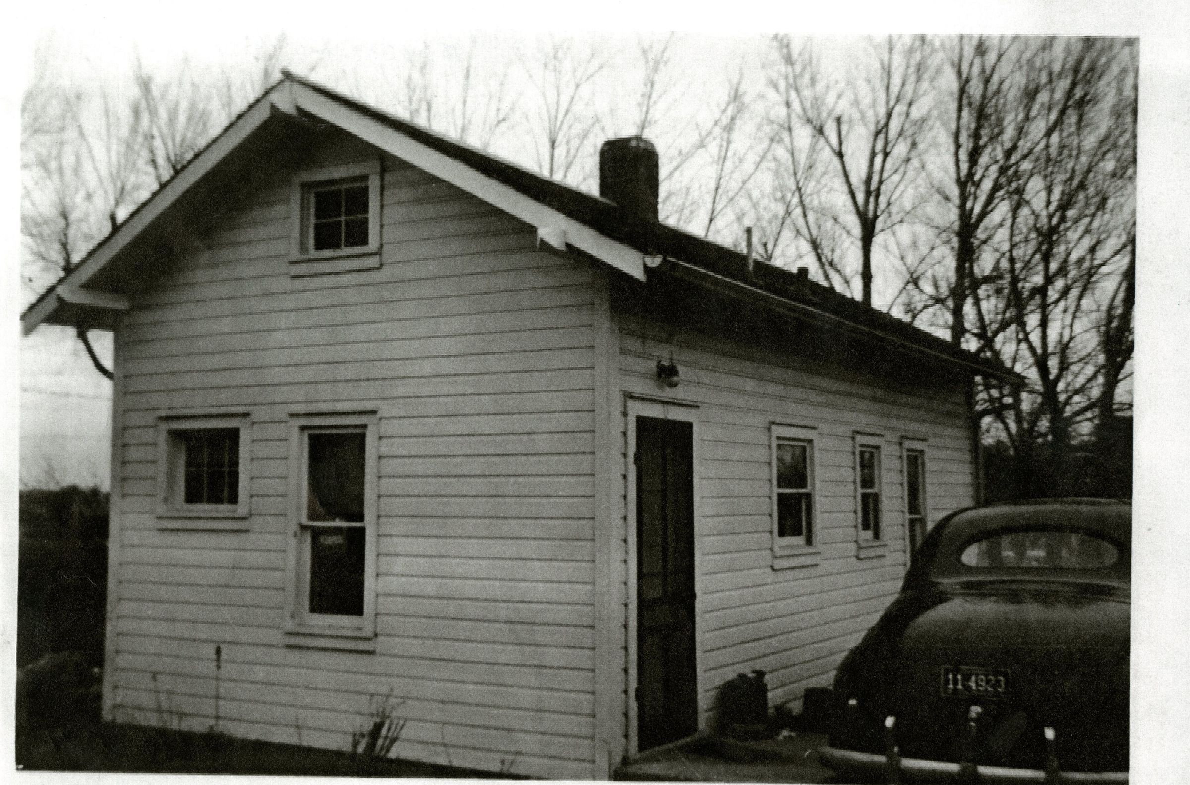 Photocopy of a photo of the Honey House, dated 1950, when it was located still on 120th. Dark colored car is parked on right.