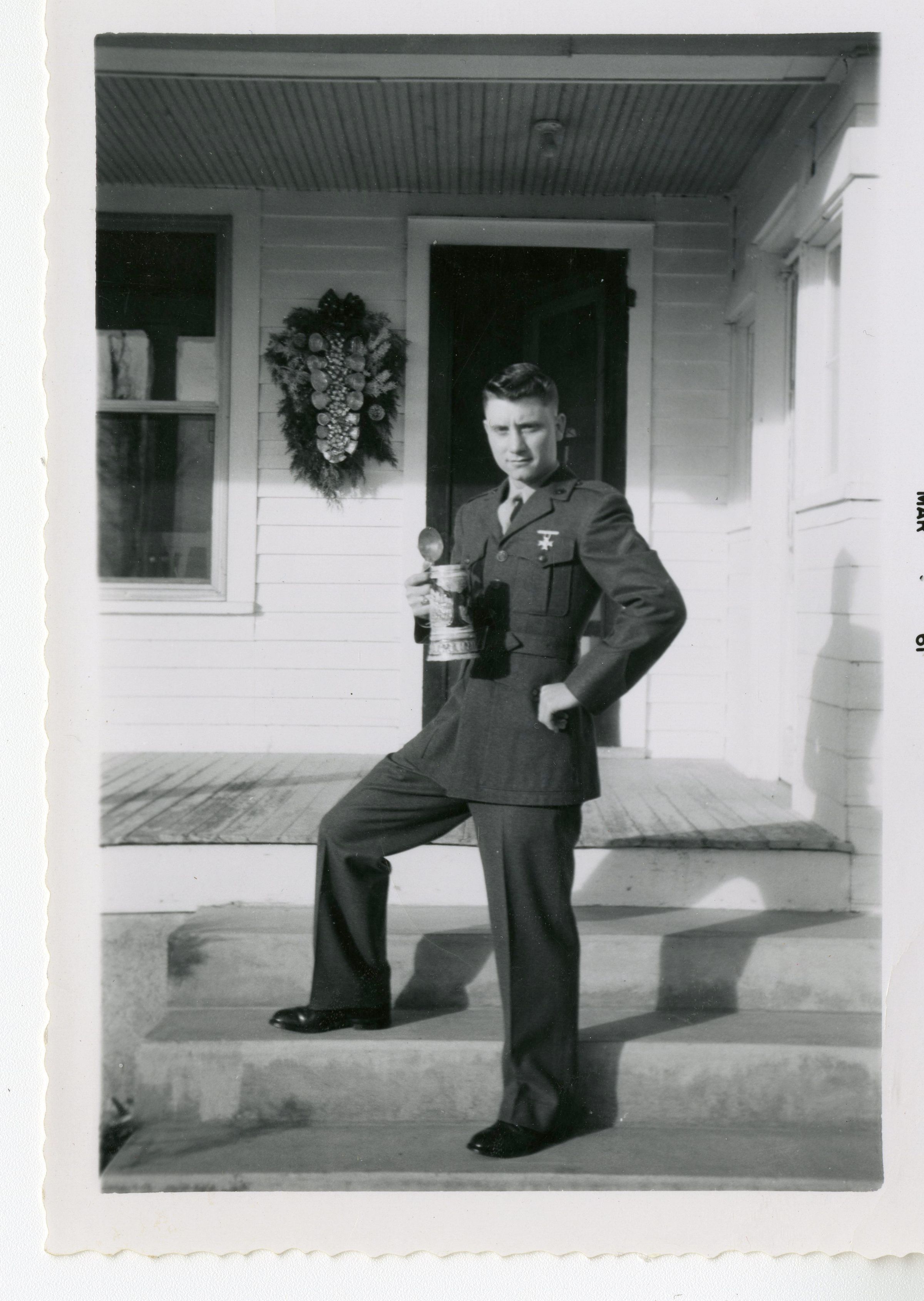 A black and white photo of Lester K outside of the Brunner Farmhouse on March of 1961.