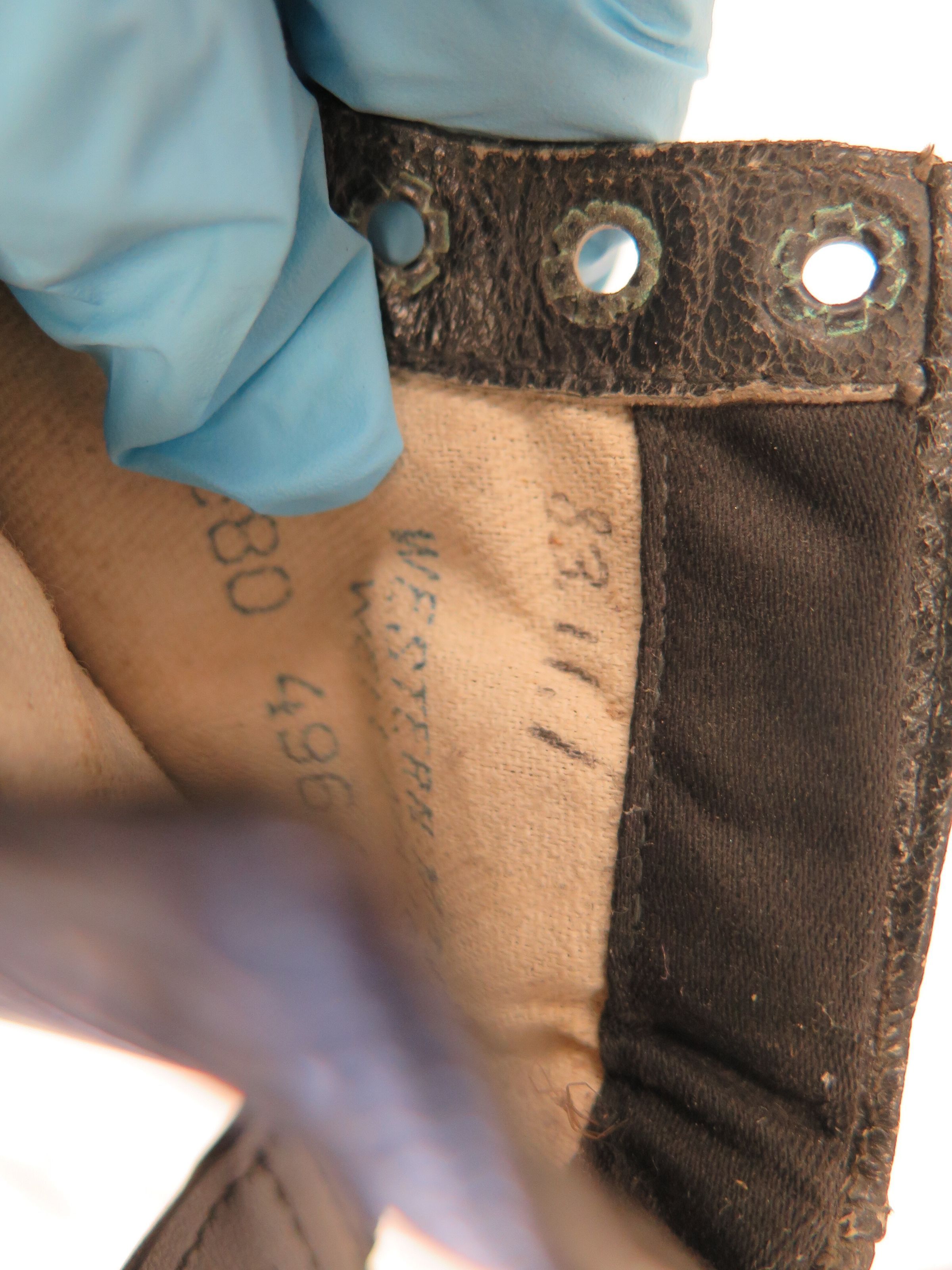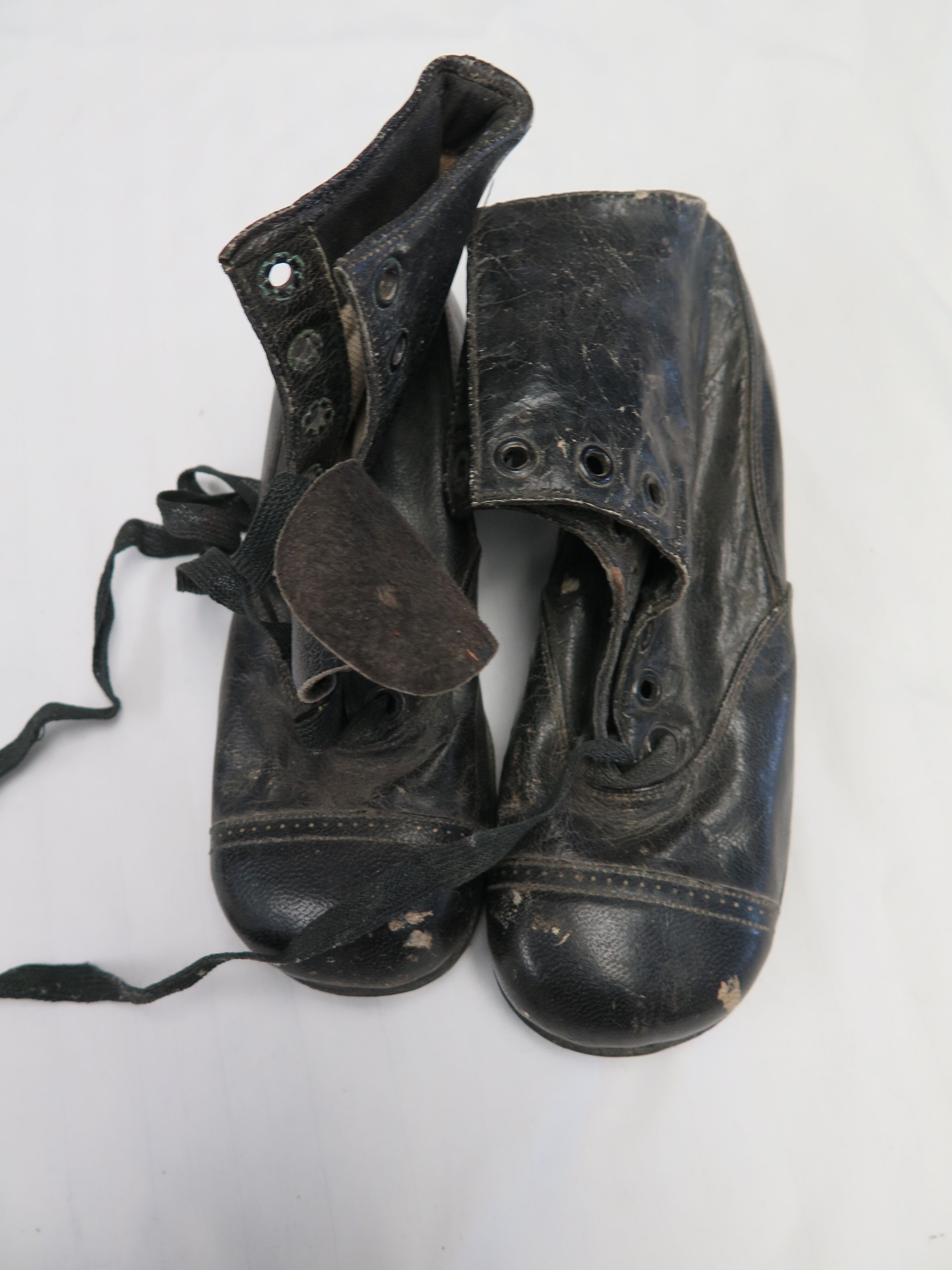 This is a pair of boy's black cap toe lace up boots. There is some broguing along the cap toe. Number inside the shoes is "580, 49644". Shoes measure 7" (h) x 2.5" (w) 4.25" (l) each.Collection