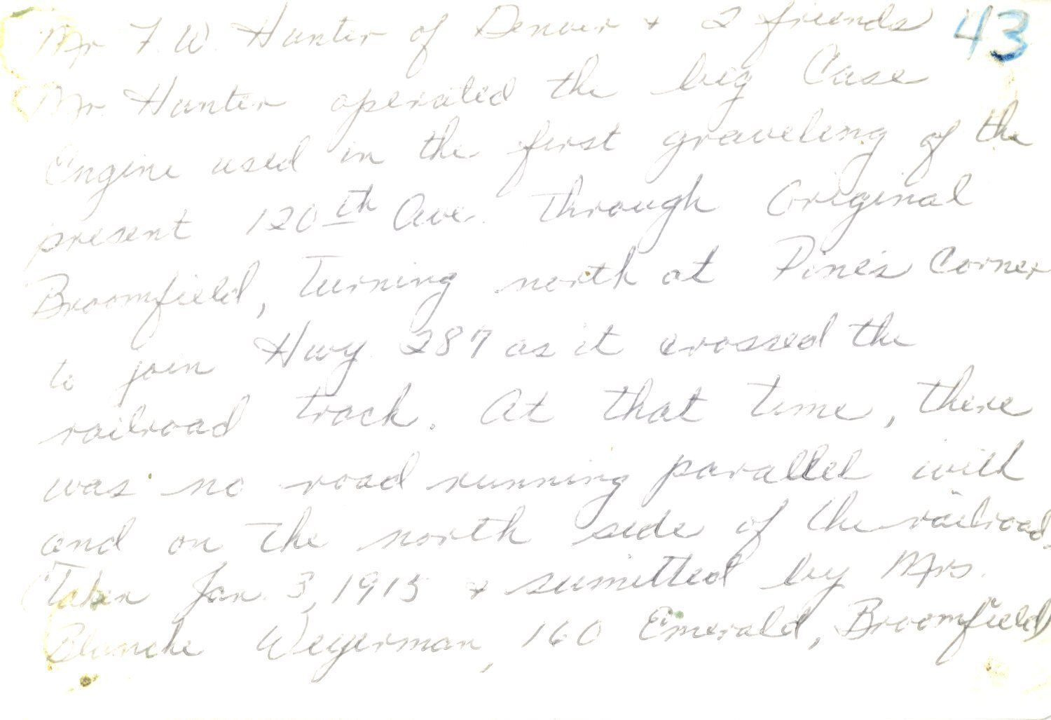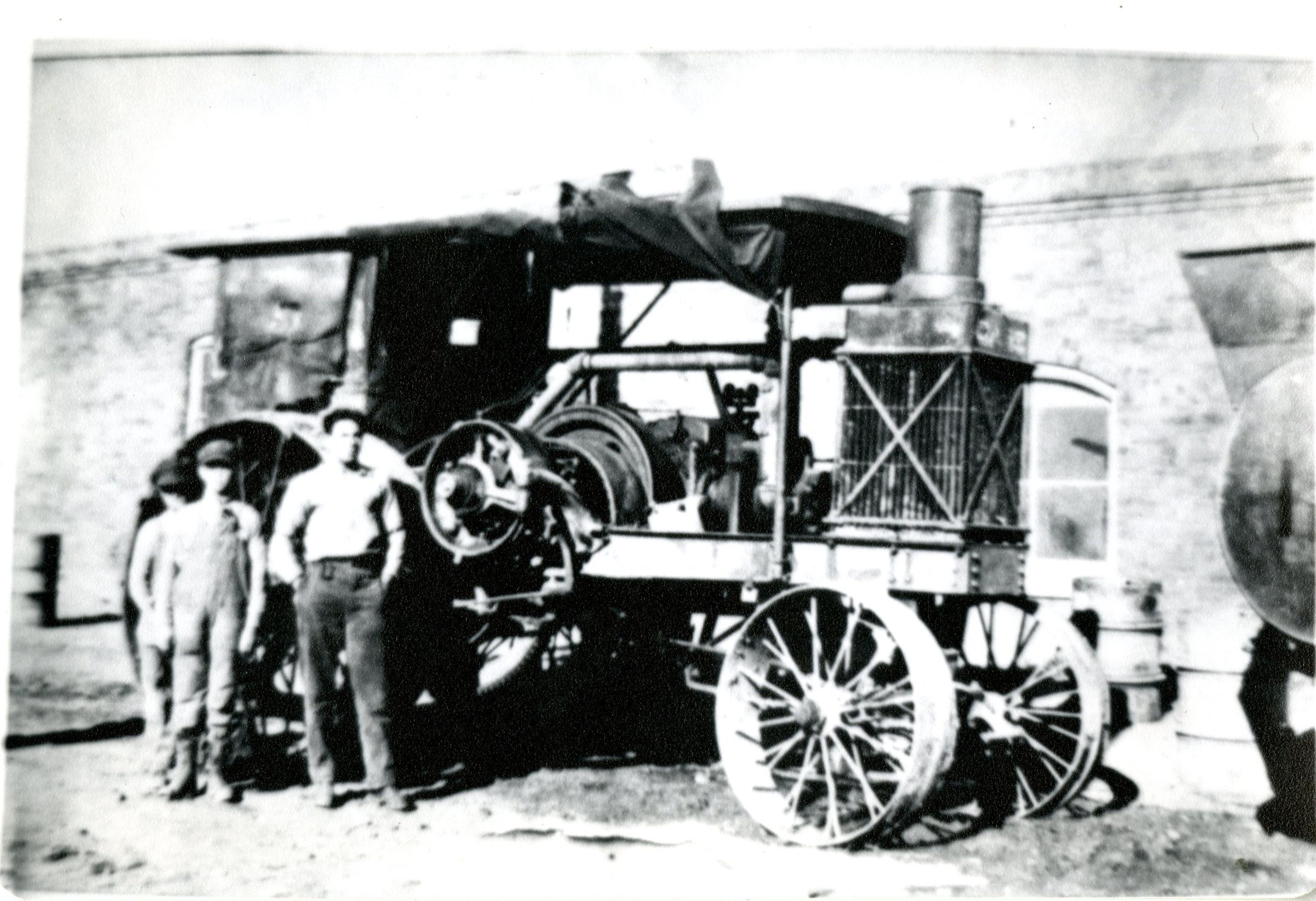 B/W photo of J. W. Hunter and two unnamed male friends standing in front of a Case Engine. The writing on the back says, to quote, Mr. Hunter operated the big Case Engine used during the first graveling of the present 120th Ave. through original Broomfield, turning north of Pines Corner to join Hwy 287 as it crossed the railroad track. At that time, there was no road running parallel with and on the north side of the railroad. (End quote.) It also states that it was taken Jan. 3, 1915 and submitted by Mrs. Blanche Weyman, 160 Emerald, Broomfield.Collection