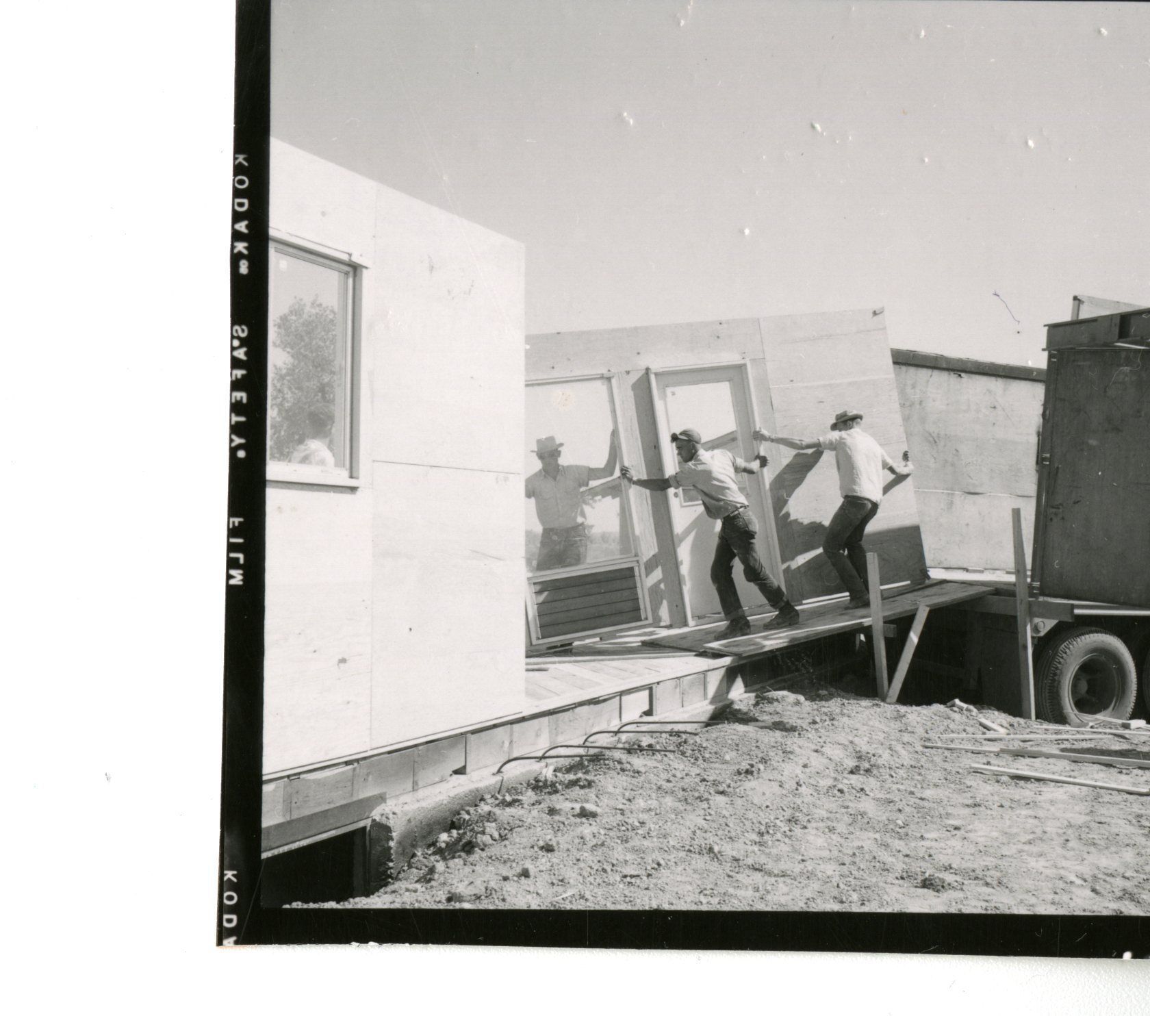 B&W contact sheet photo of construction workers building a building (house?) in Broomfield Heights. Three men moving a wall with a door and window off of a trailer onto the foundation.