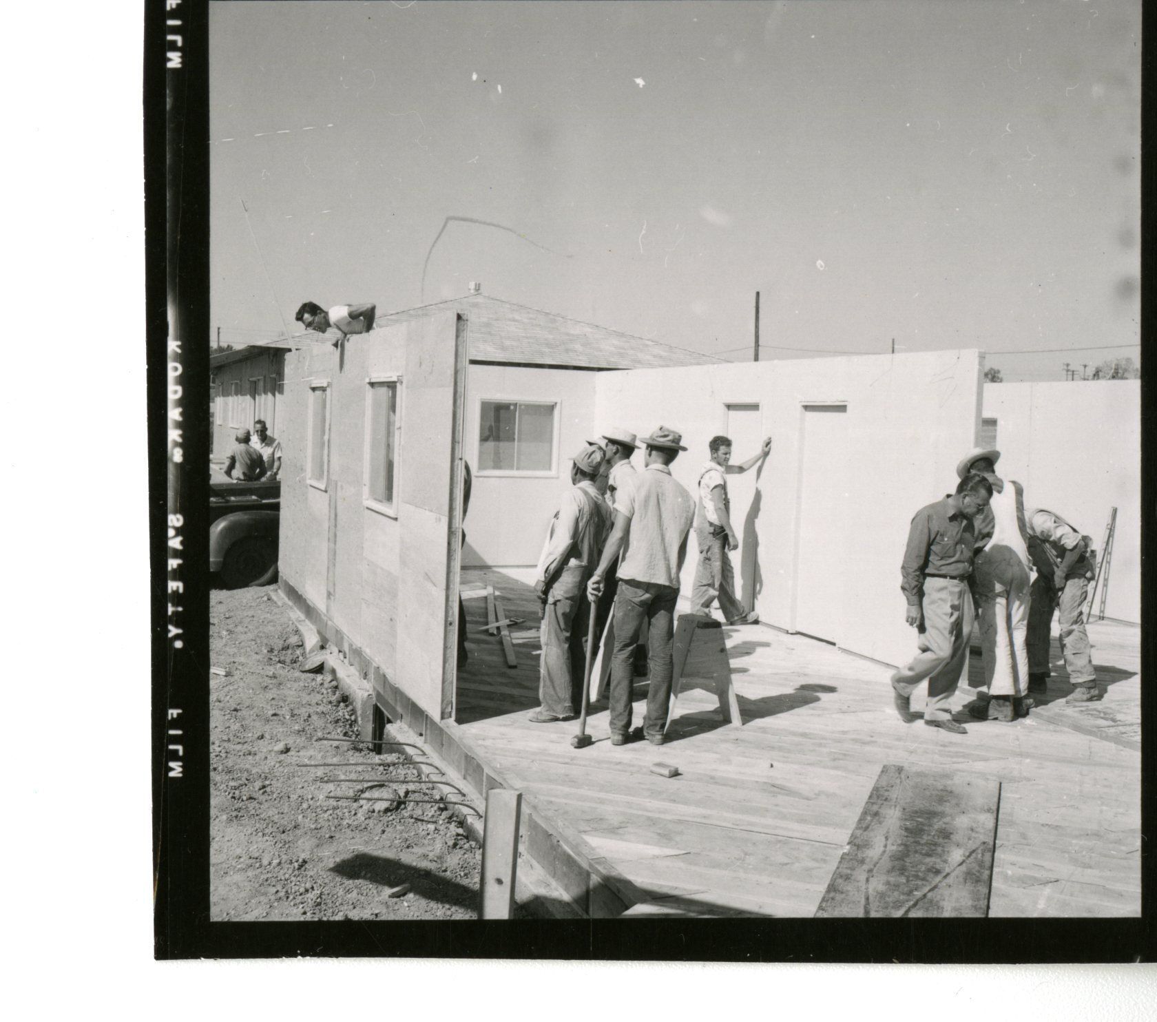 B&W Contact Sheet Photo of construction working building a building (home?) in Broomfield Heights. Eight men are securing walls onto foundation of building (home?). Two men in background of photo appear to be talking to one another.
