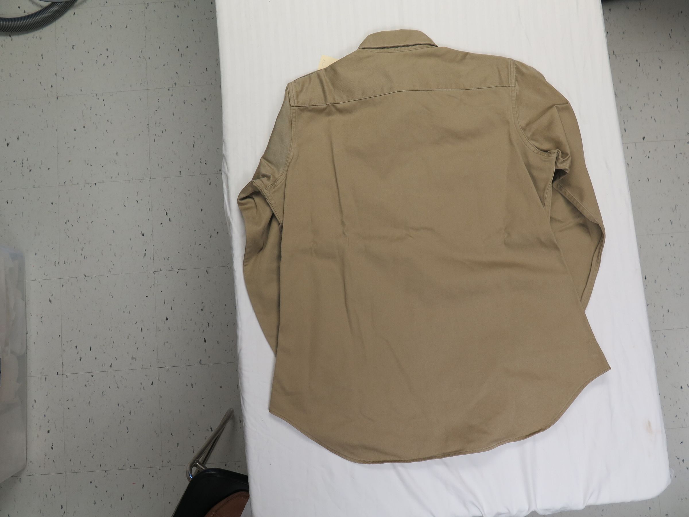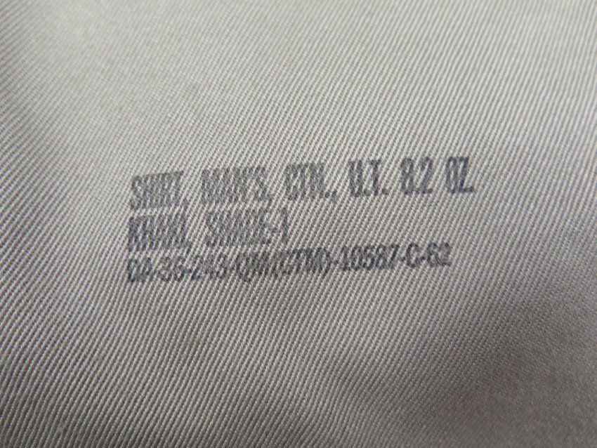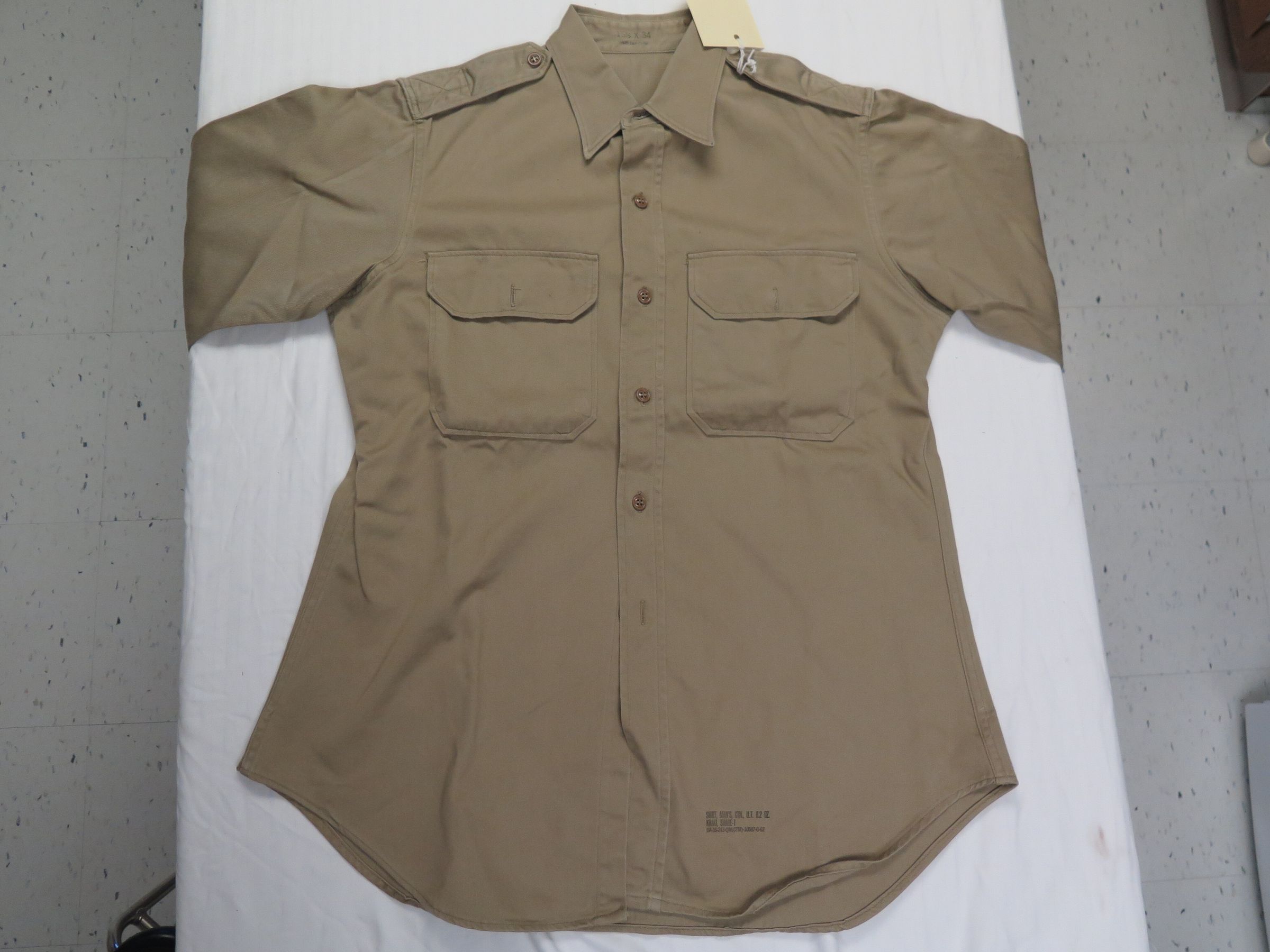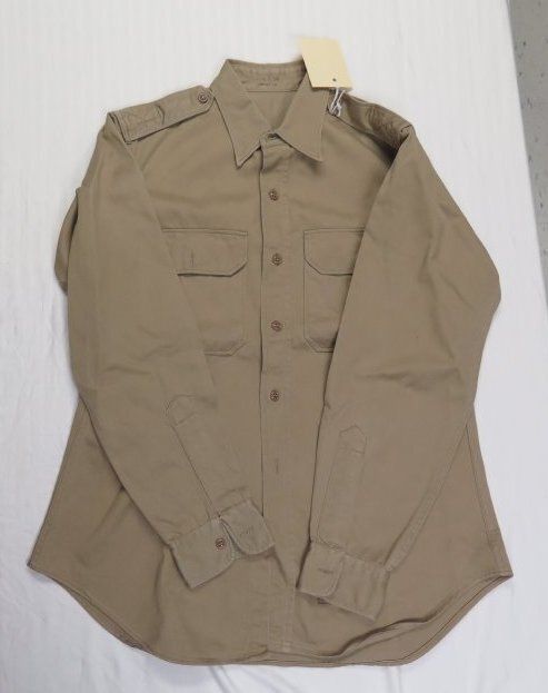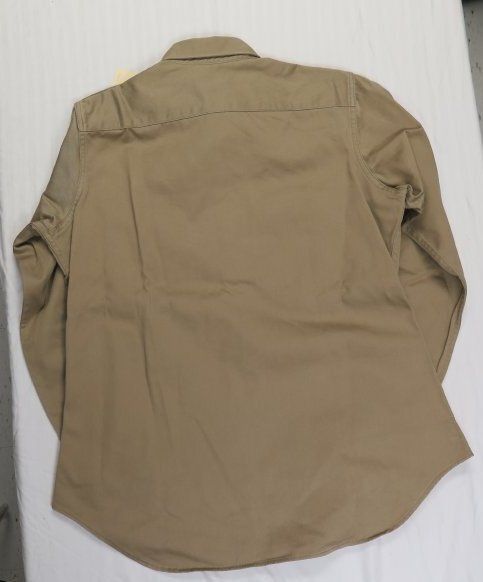 This is one men's military issue khaki shirt. The shirt is labeled as being "Shirt, Man's, Ctn. UT 8.2 oz./ Khaki Shade-1/ Da-36-243-QM(CTM)-10587-C-62" near the bottom left hem. Inside the pocket of the shirt a yellow Shine-E-Z cloth was found. The shirt measures 25" (w) x 32" (l).
