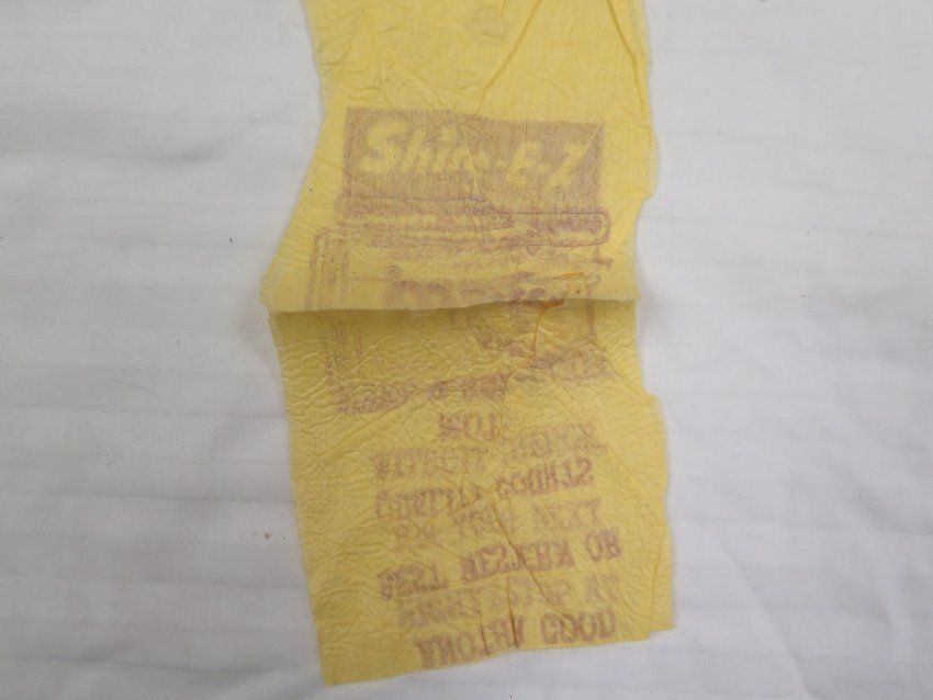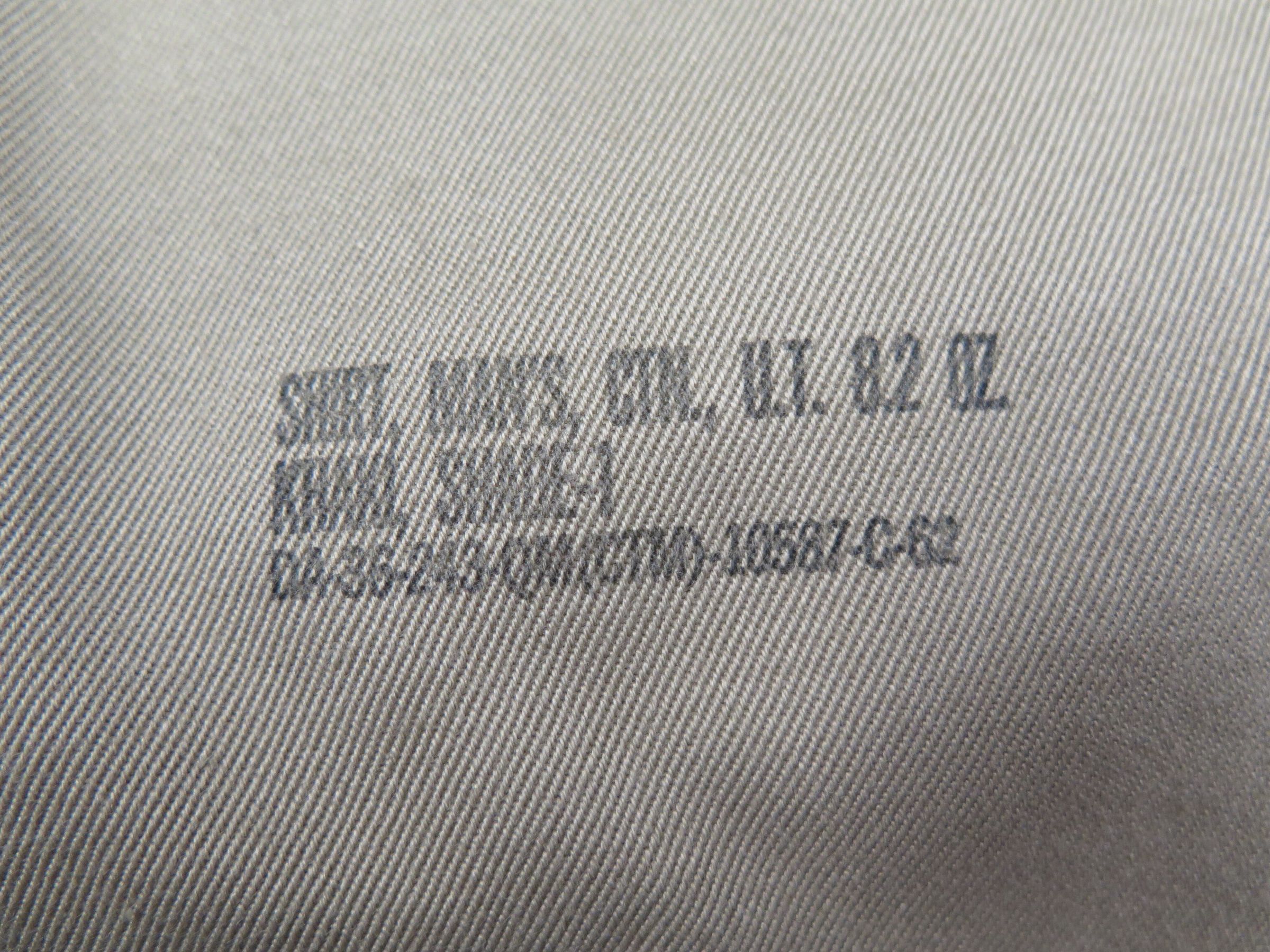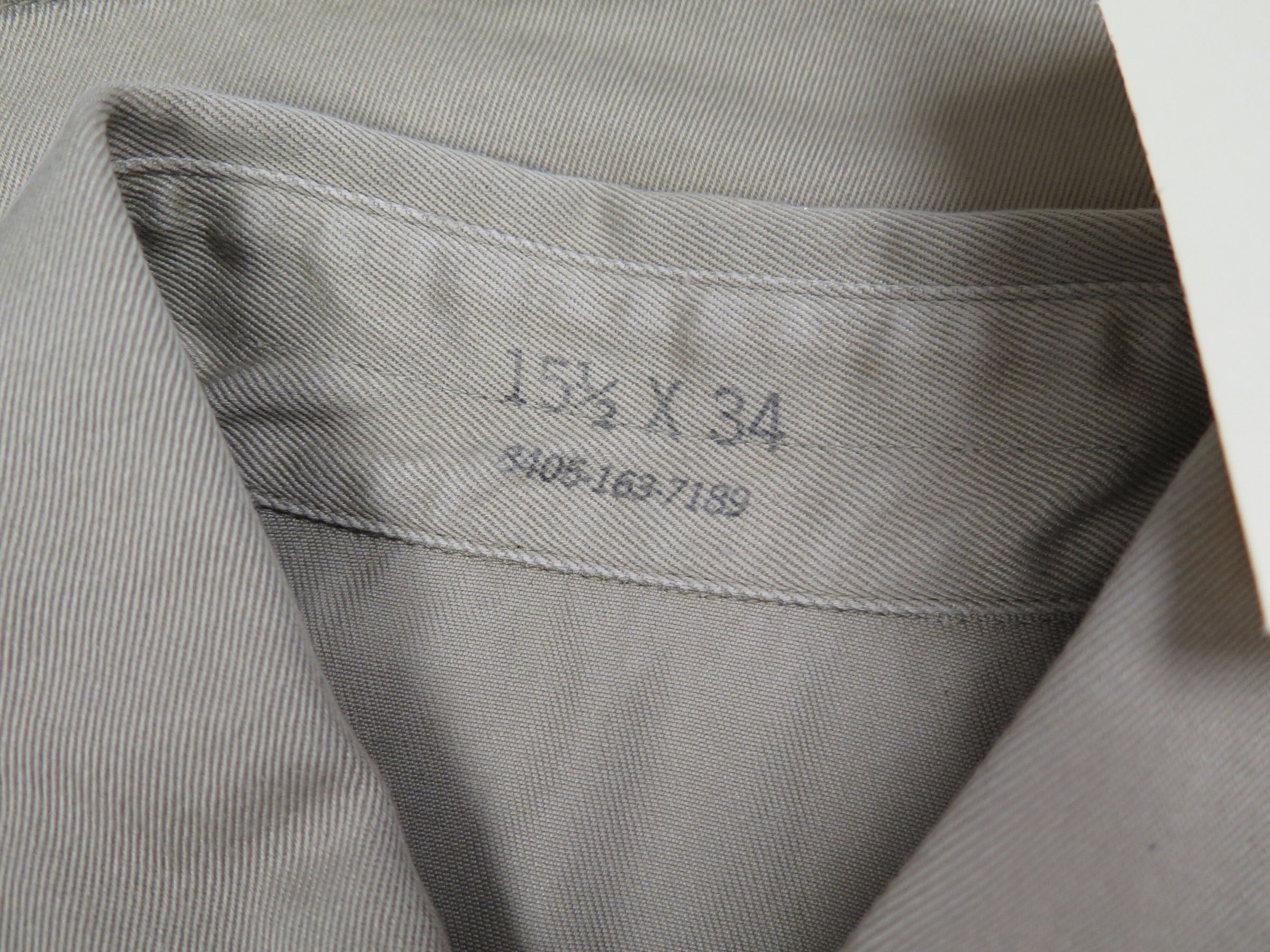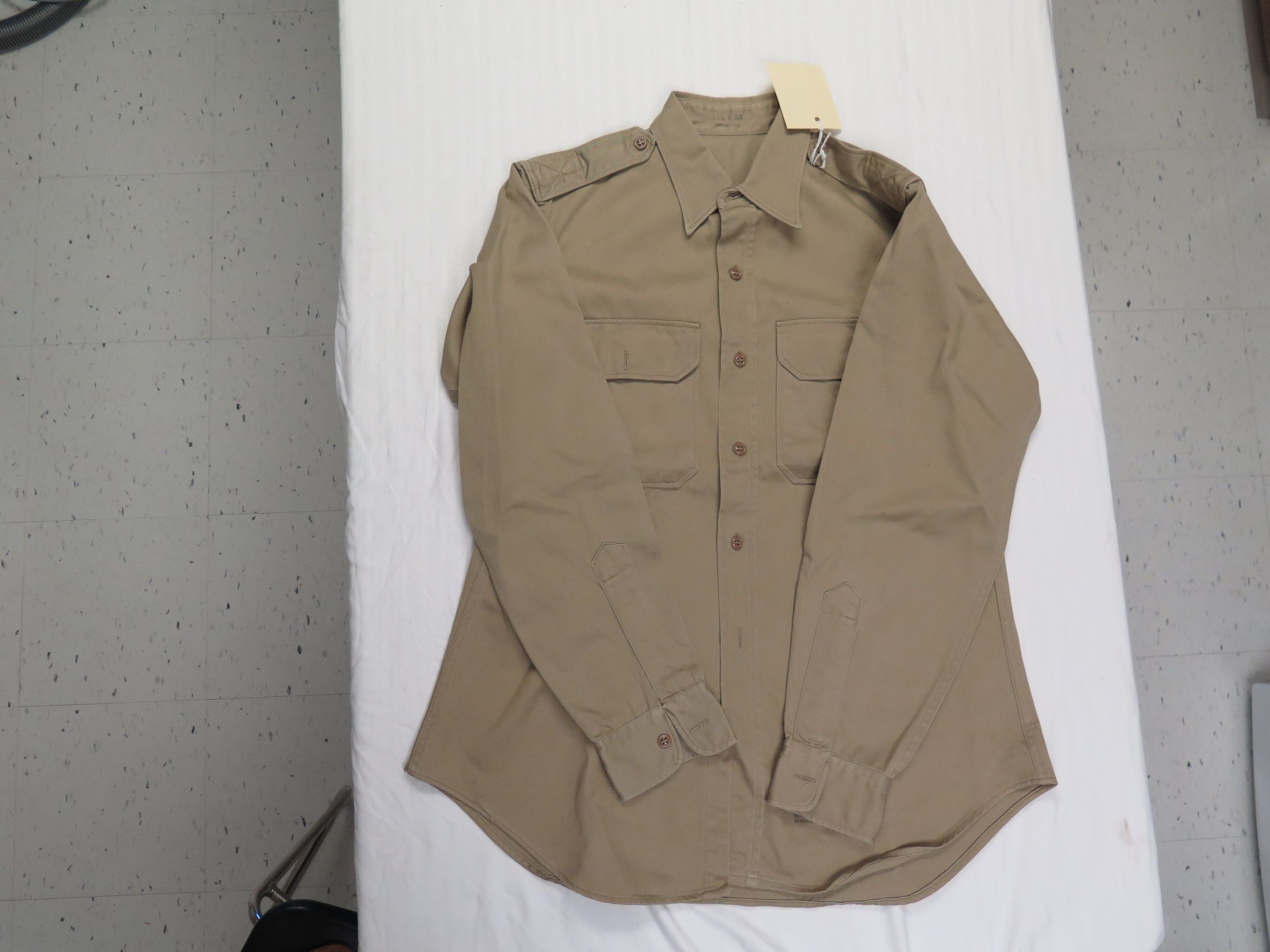 This is one men's military issue khaki shirt. The shirt is labeled as being "Shirt, Man's, Ctn. UT 8.2 oz./ Khaki Shade-1/ Da-36-243-QM(CTM)-10587-C-62" near the bottom left hem. Inside the pocket of the shirt a yellow Shine-E-Z cloth was found. The shirt measures 25" (w) x 32" (l).
