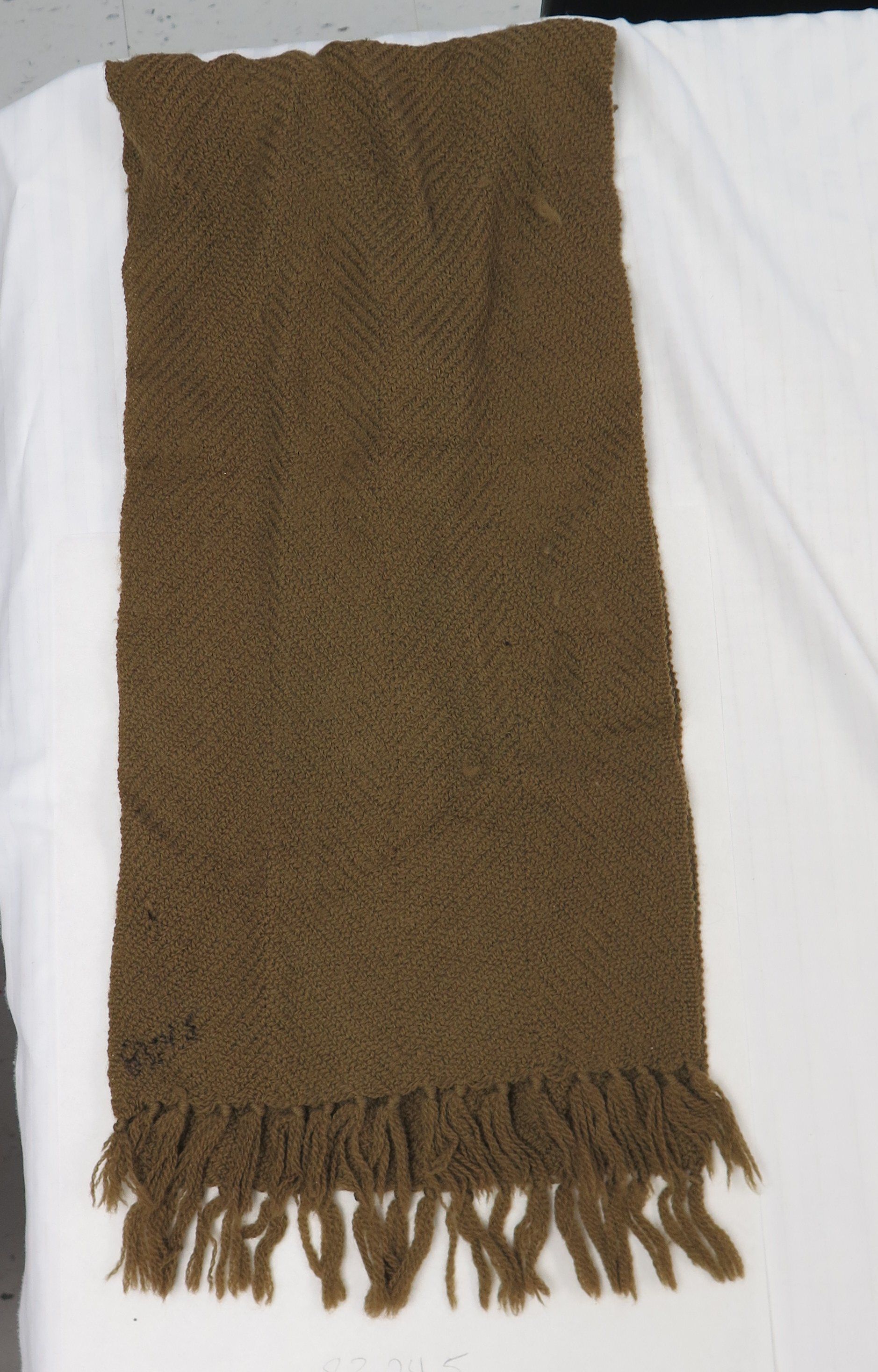 This is an olive green wool US Army Air Corps scarf. There is fringe at both ends of the scarf. The scarf measures 10" (w) x 46" (l).