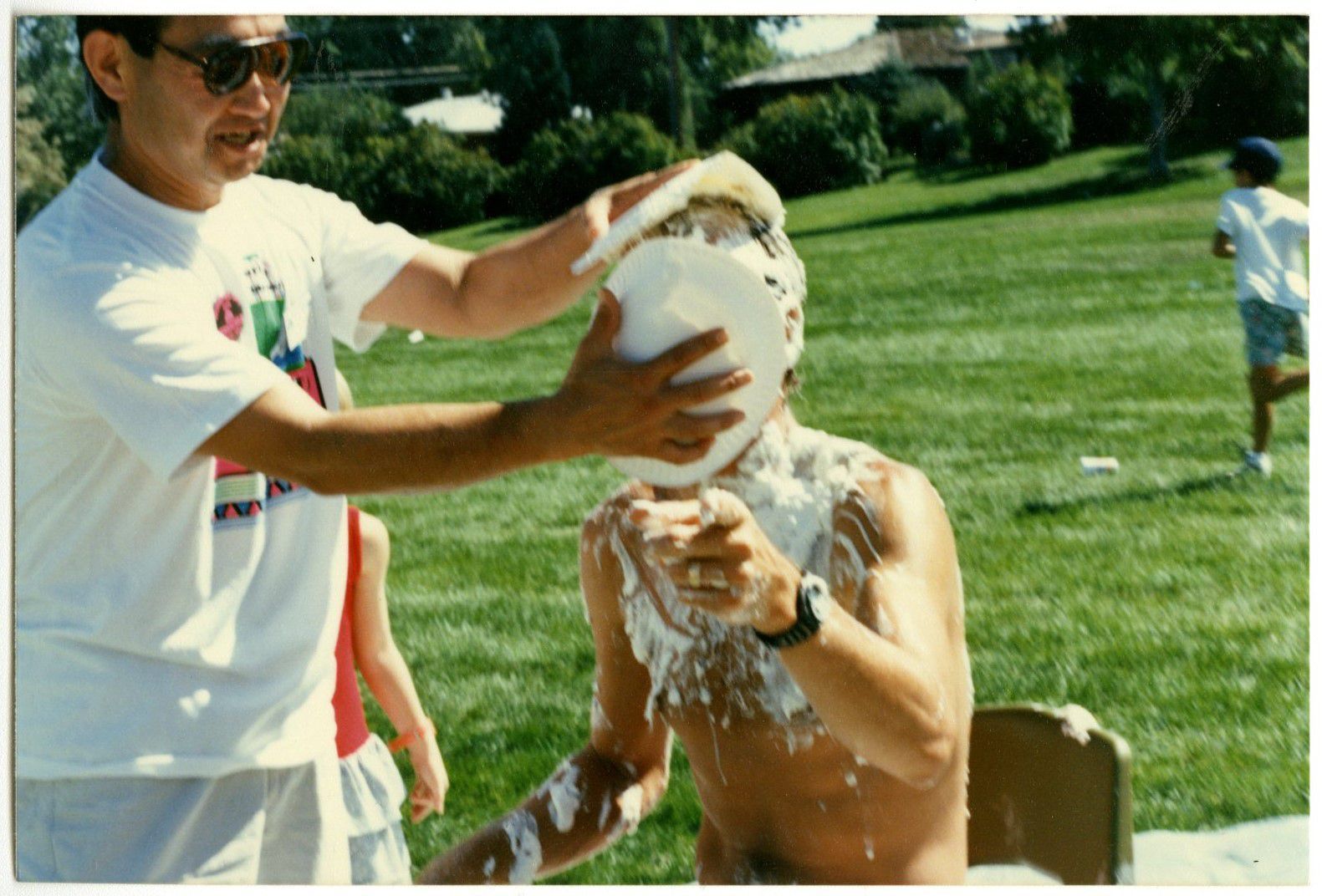 Item is a colored photograph taken during the 1990 Broomfield Days celebration. The photo centers around Bob Sakaguchi, who is wearing a white t-shirt and sunglasses, pie-ing a shirtless blond boy in the face as he points at the camera. A child is visible behind him, watching the fun, and another is running in the grassy field that makes up the background. Tall trees, bushes, and homes complete the view. Bob Sakaguchi was the Broomfield Councilmember representing Ward 4, elected on November 3, 1987. His term expired in 1991.Photograph Details