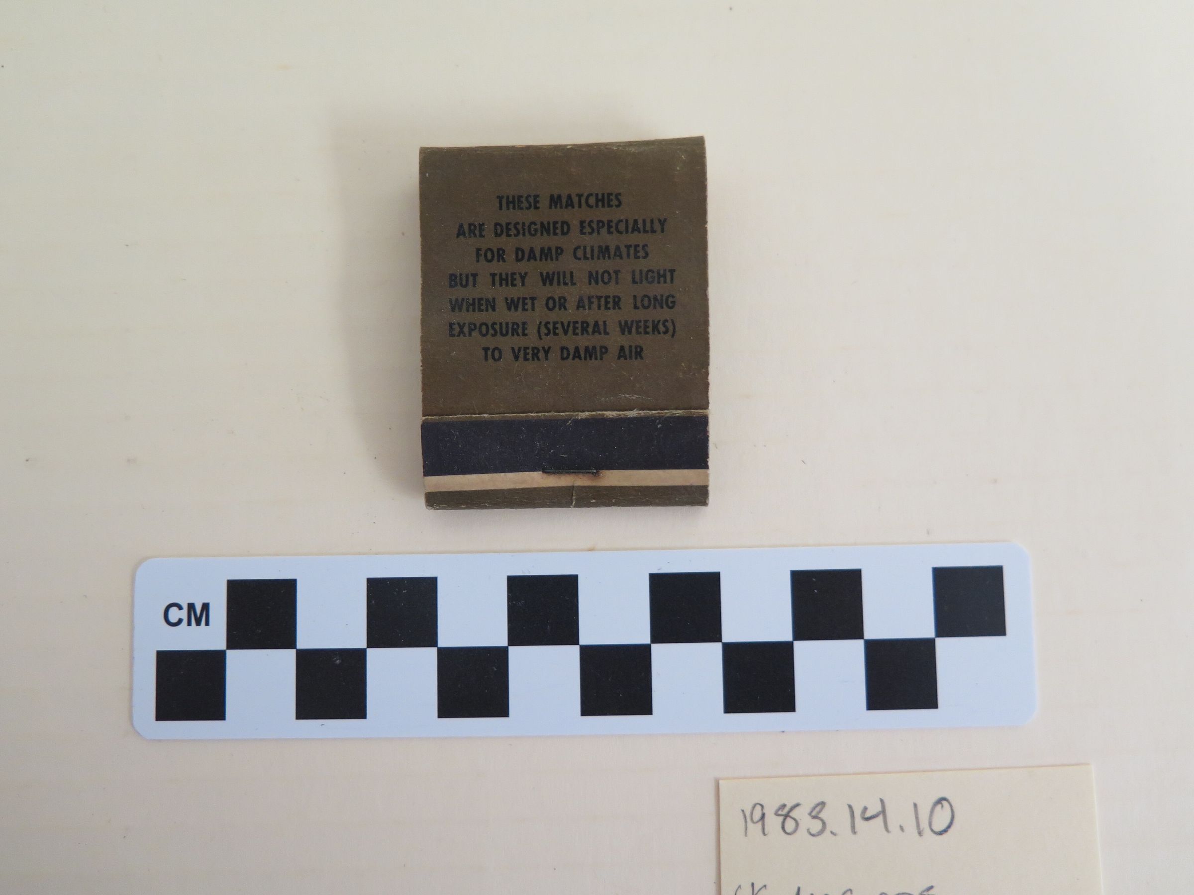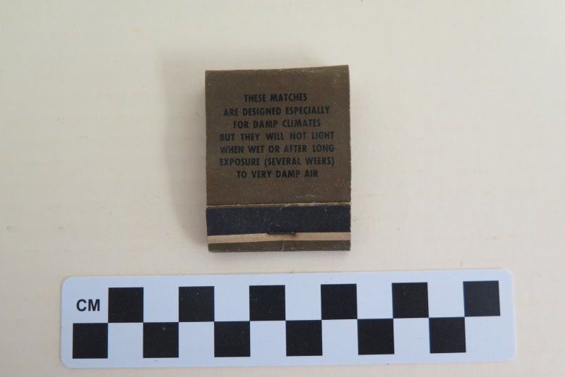 This is a matchbook from US Army Air Corps. The matchbook is brown cardboard with black text that reads," These matches/ are designed especially/ for damp climates/ but they will not light/ when wet or after long/ exposure (several weeks)/ to very damp air". The matches are still inside. The matchbook measures 0.5" (h) x 1.75" (w) x 2" (l).