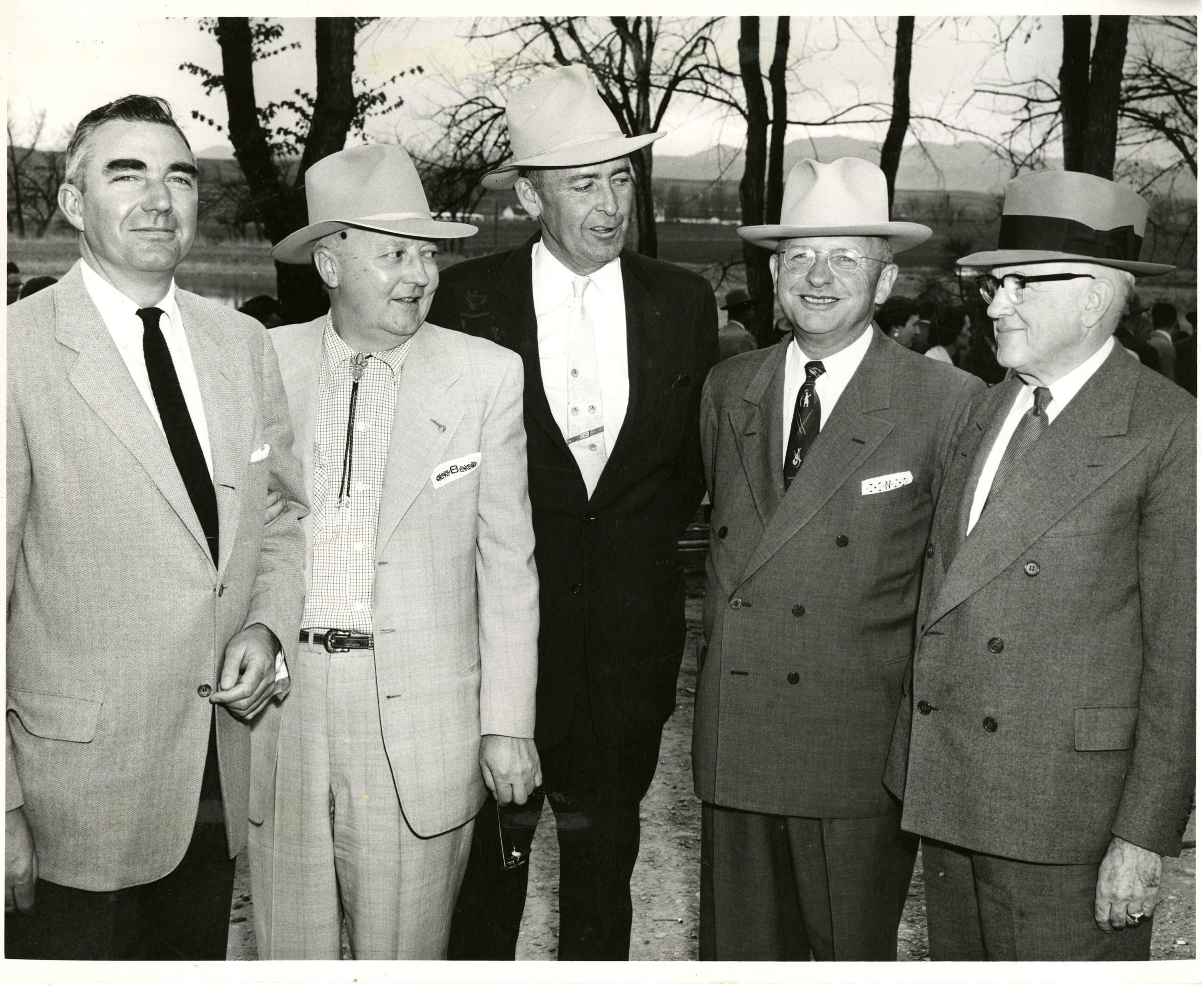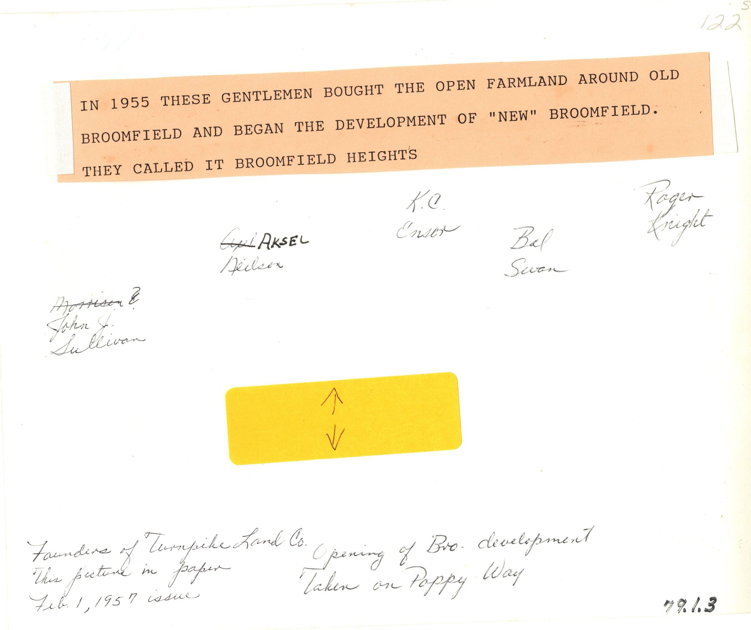 B&W photo of five gentlemen. Orange note on the back reads "In 1955 these gentlemen bought the open farmland around old Broomfield and began the development of 'new' Broomfield. They called it Broomfield Heights." Gentlemen in photo from left to right: Rodger Knight, Bal Swan, K.C. Ensor, Aksel Neilson, and John J. Sullivan.Collection