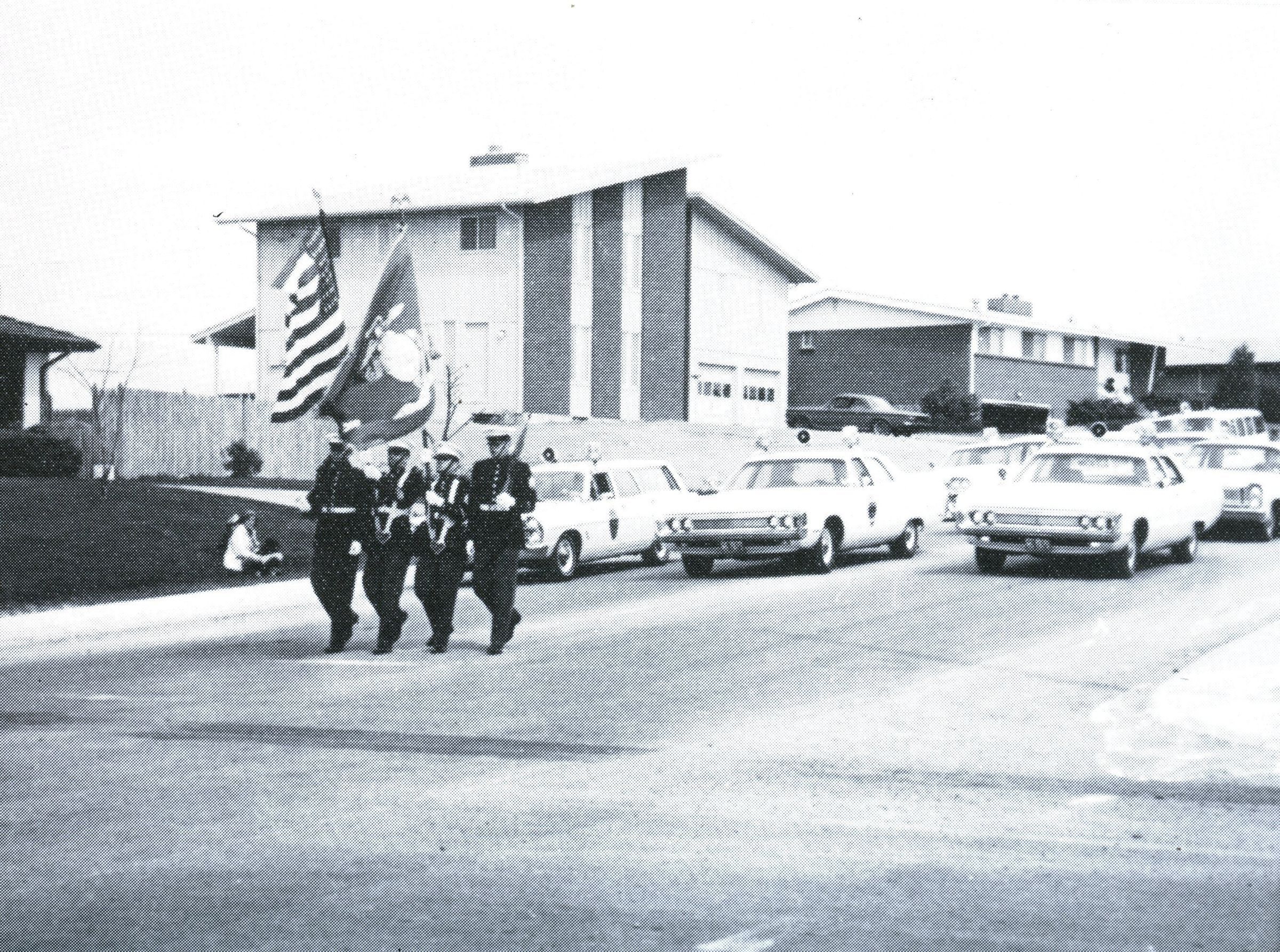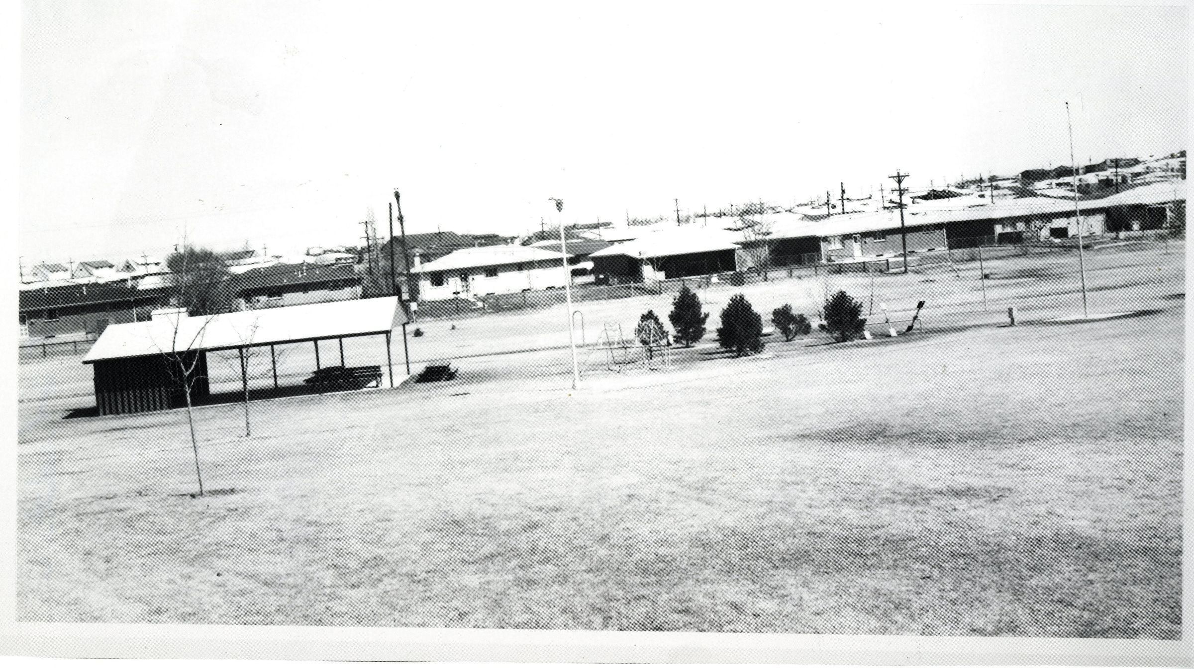 Black and white photo circa 1964 of new Girl Scout shelter at North Midway Park, looking towards 2nd filing neighborhood Broomfield Heights. Also shows picnic tables, playground equipment, small pine trees several ranch style houses. Date approximated by article in Broomfield Star-Builder, volume9, number 41, April 2, 1964, page 1.Collection