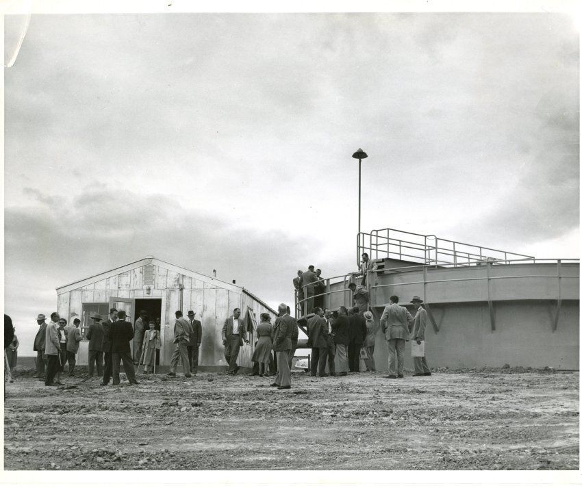 Black and white photo of sewage plant tank with small white building to the left. A few dozen Denver real estate agents (men and women) were bussed to the location to tour the facility. Date was approximated based on article in the Broomfield Star-Builder newspaper, volume 4, number 5, July 31, 1958, page 16.Collection