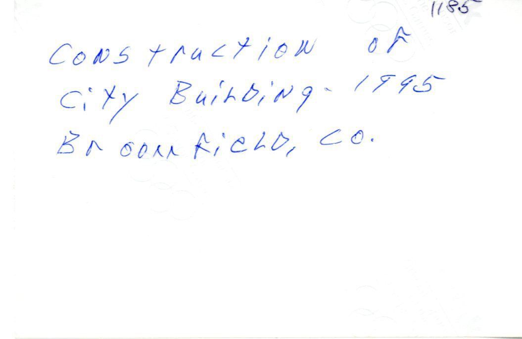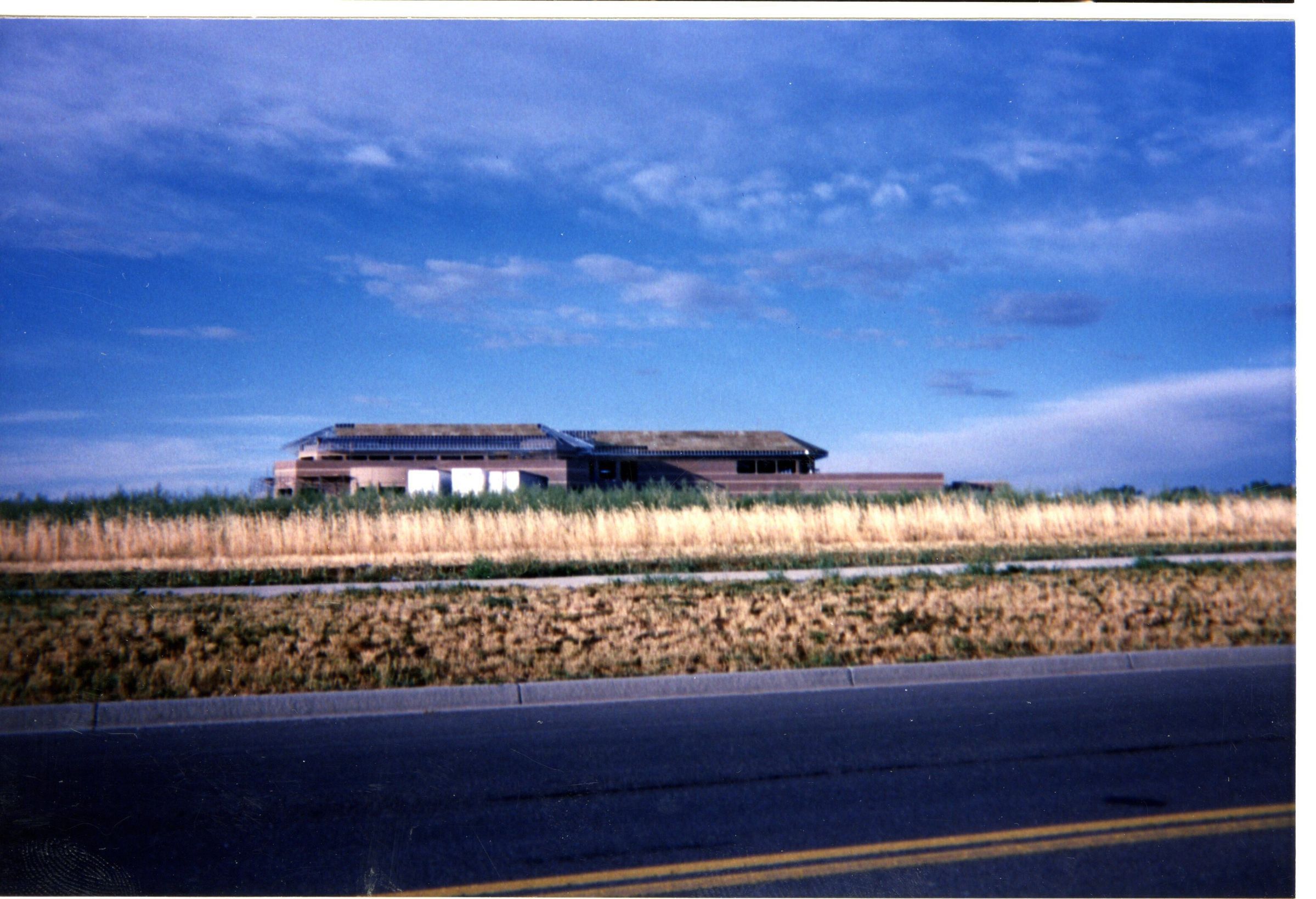 Color photo of Broomfield city government building located at 1 Descombes Drive, Broomfield. Also known as the George Di Ciero City and County Building. Shows large grass field with large light colored stone / brick building.