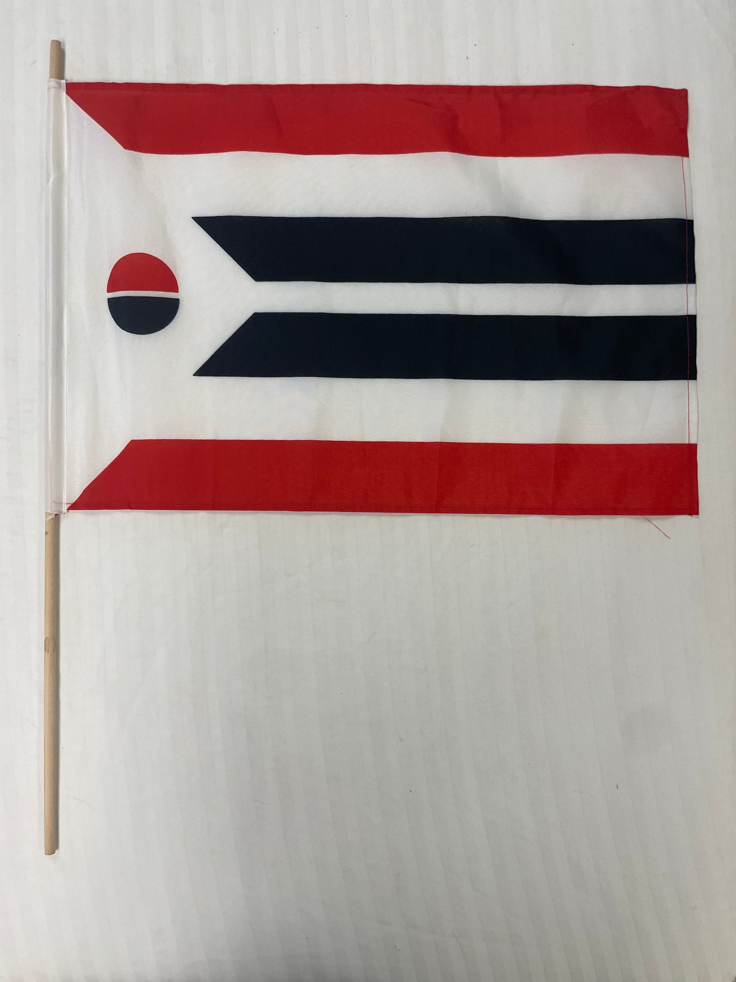 Arapaho Flag collected by staff at 2022 Arapaho Day in Strasburg, CO. 12x17in polyester flag with red, white and black stripes. On the left center is a divided red and black circle surrounded by white.Collection