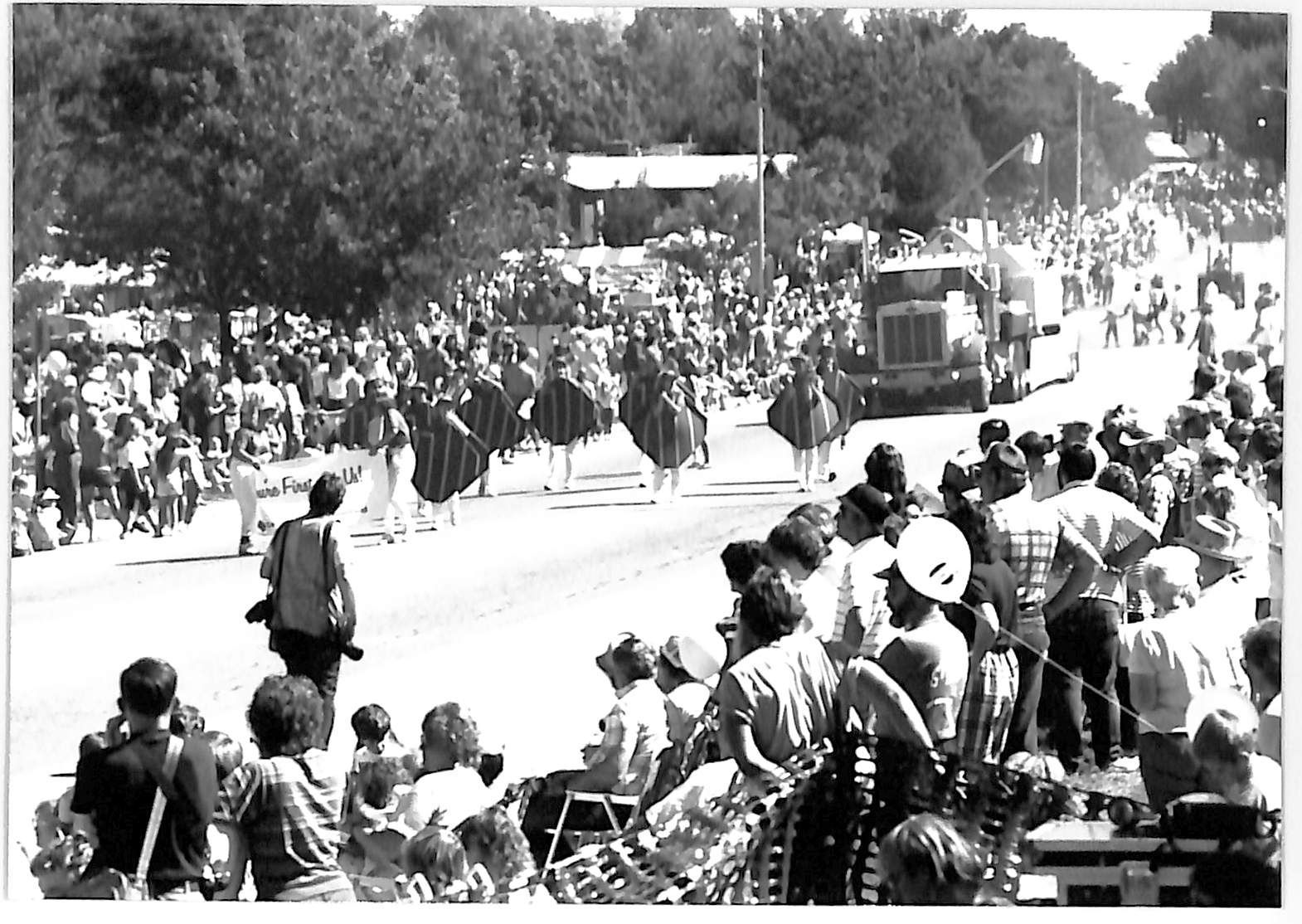 Item is a black-and-white photograph taken during the 1989 Broomfield Days event. In the photo, crowds have gathered on both sides of the street to view the parade. On the side that the picture was taken from, the people are sitting within a netted-off area. Some people in diamond-shaped costumes are walking down the street, led by two people carrying a banner between themselves. Behind them, a large maintenance service vehicle is driving along, followed by some more parade features. Tents and trees frame the background of the photo.Photograph Details