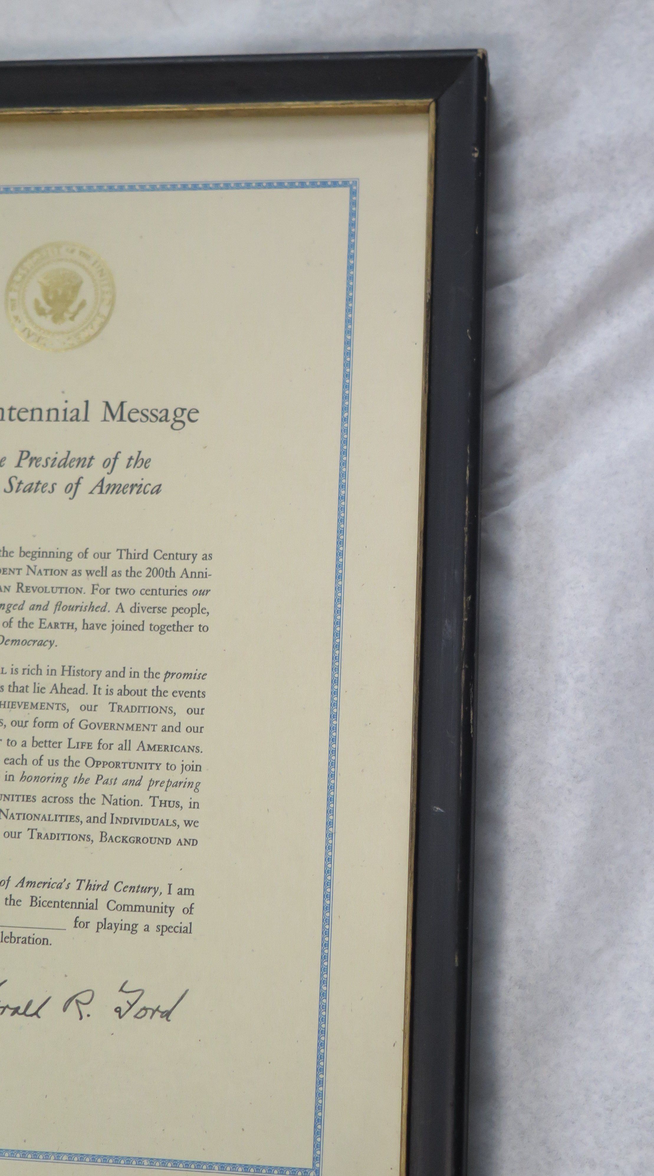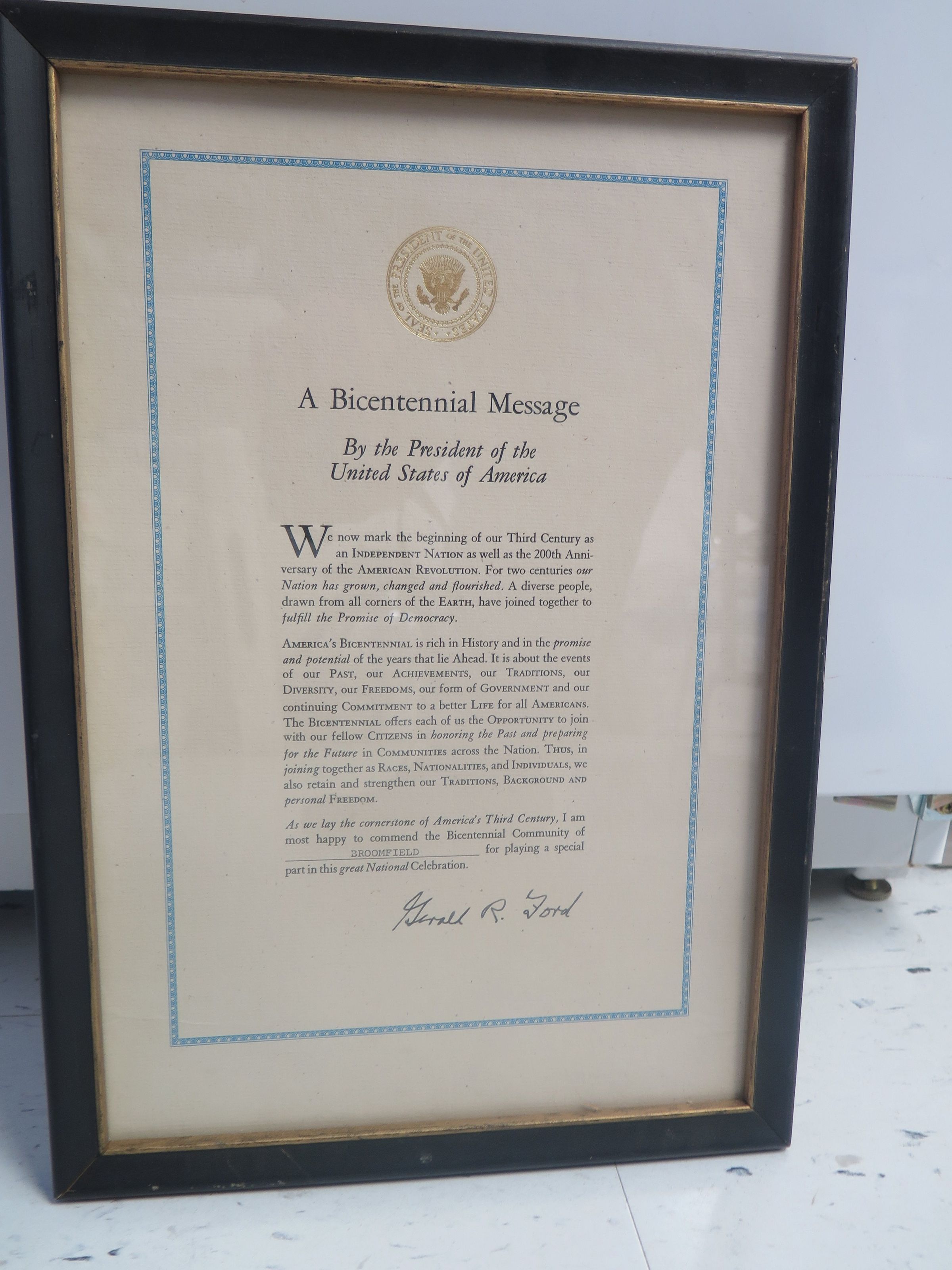 This is a framed Bi-Centennial message plaque signed by President Gerald Ford. 16"(H) x 11"W)