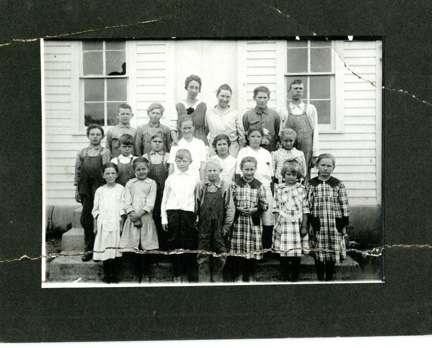 Students and teacher standing on front of Old Broomfield School at 10th and Main. No date-possibly early 1900's.