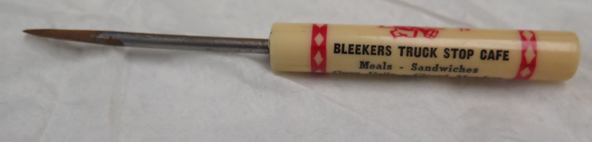 This ice pick has a plastic handle that bears text in black letters "Bleekers Truck Stop Café".