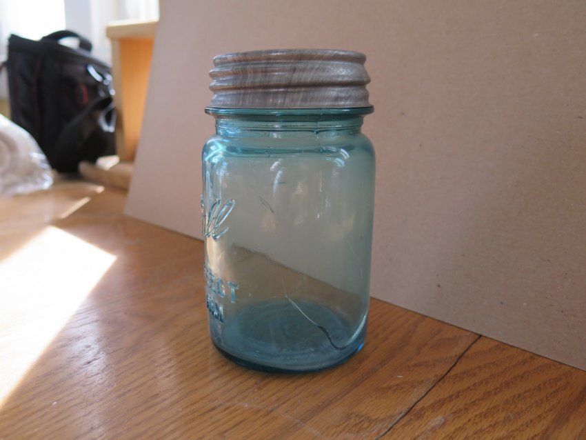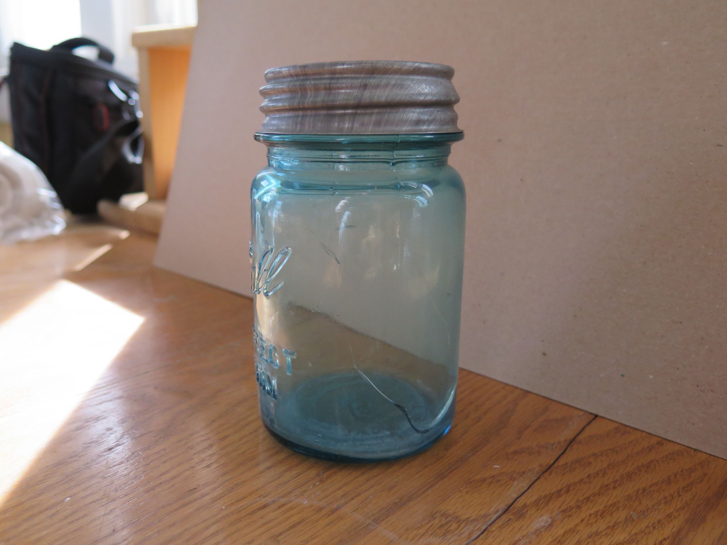 Blue glass canning jar with text that reads "Ball Perfect Mason" with glass lined metal lid. The glass jar body is cracked. The lid reads "Ball." The jar measures 5.25"(h) x 3" (diam).