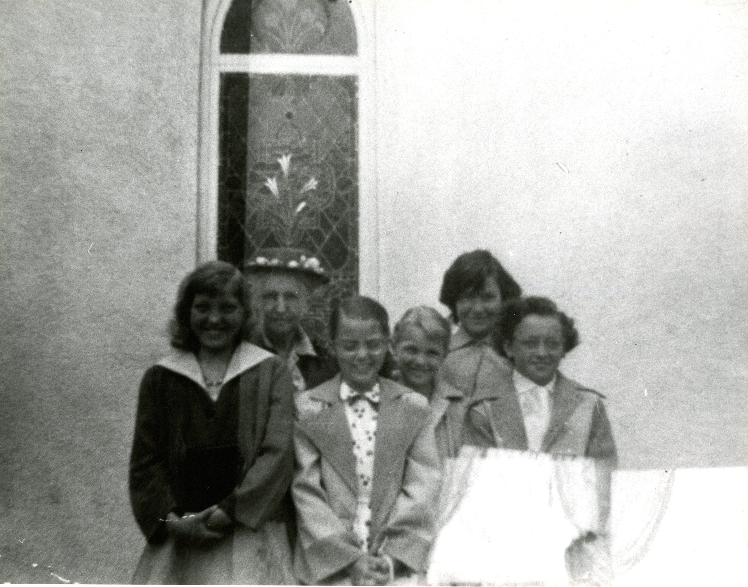 Viola Crook's Sunday School class. Possibly 1950-1960. Viola is in the back with a hat on. They look to be standing in front of the church window.