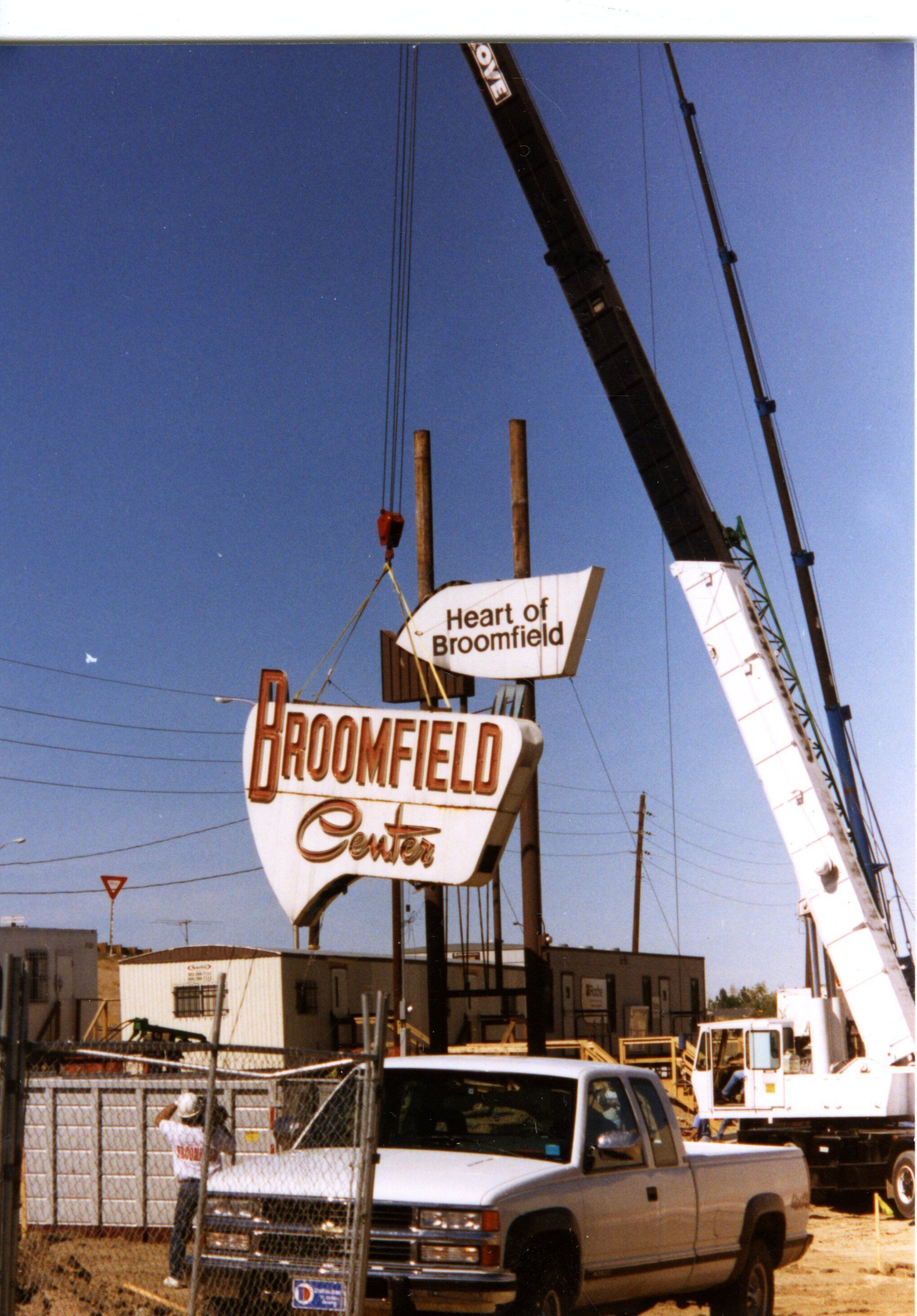 Broomfield Center sign / Heart of Broomfield sign being removed October 1994. Photo shows sign being lowered by a crane. Sign was from the original shopping / strip mall on the site at the intersection of Midway, 287, and 36.Collection