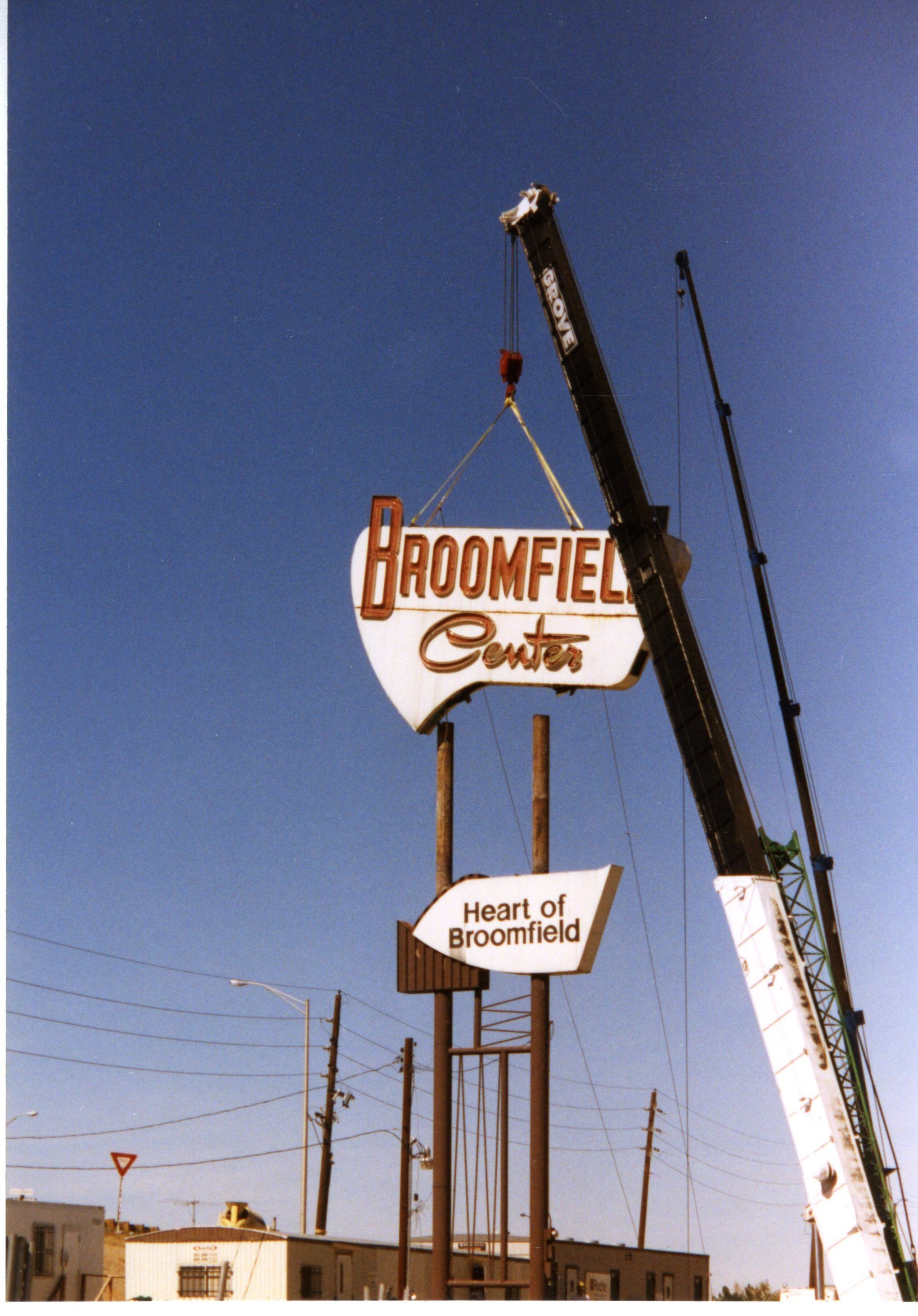 Broomfield Center sign / Heart of Broomfield sign being removed October 1994. Photo shows sign being lowered by a crane. Sign was from the original shopping / strip mall on the site at the intersection of Midway, 287, and 36.Collection