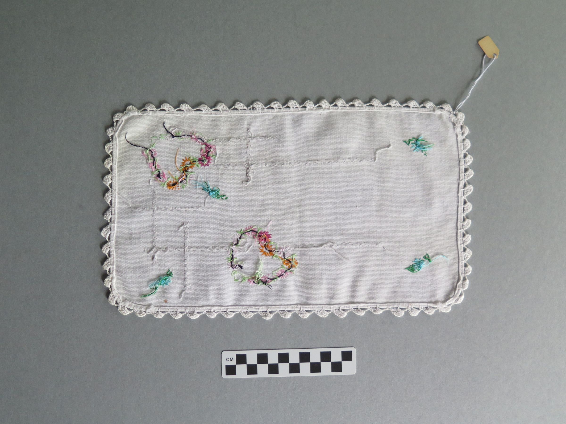 Small white furniture scarf. Part of three piece dresser scarf set with pink heart and blue flowers embroidered on it. The furniture scarf measures 7.5" (w) x 13" (l).