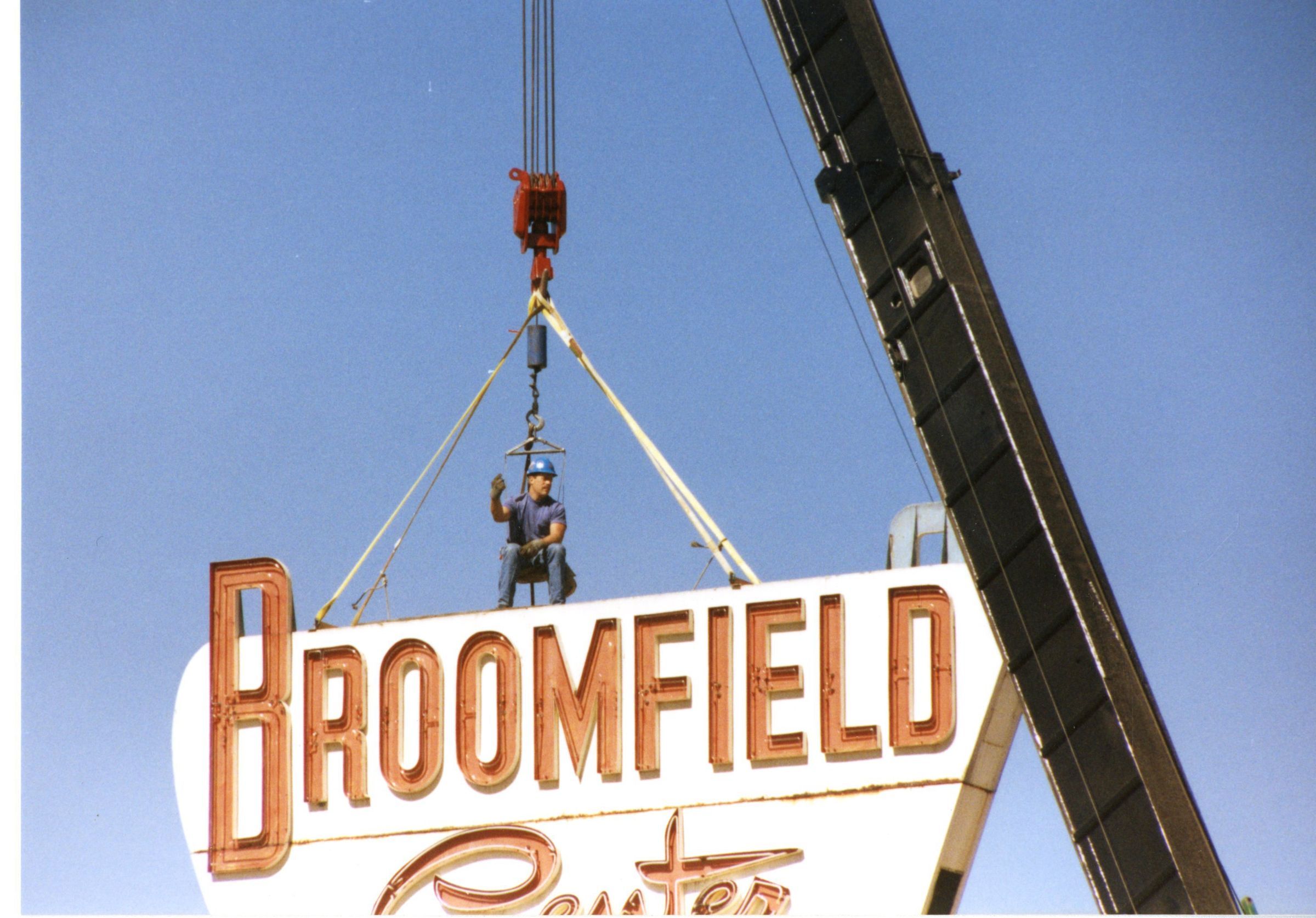 Broomfield Center sign / Heart of Broomfield sign being removed October 1994. Photo shows sign being attached to crane by construction worker in harness behind/above sign. Sign was from the original shopping / strip mall on the site at the intersection of Midway, 287, and 36.Collection