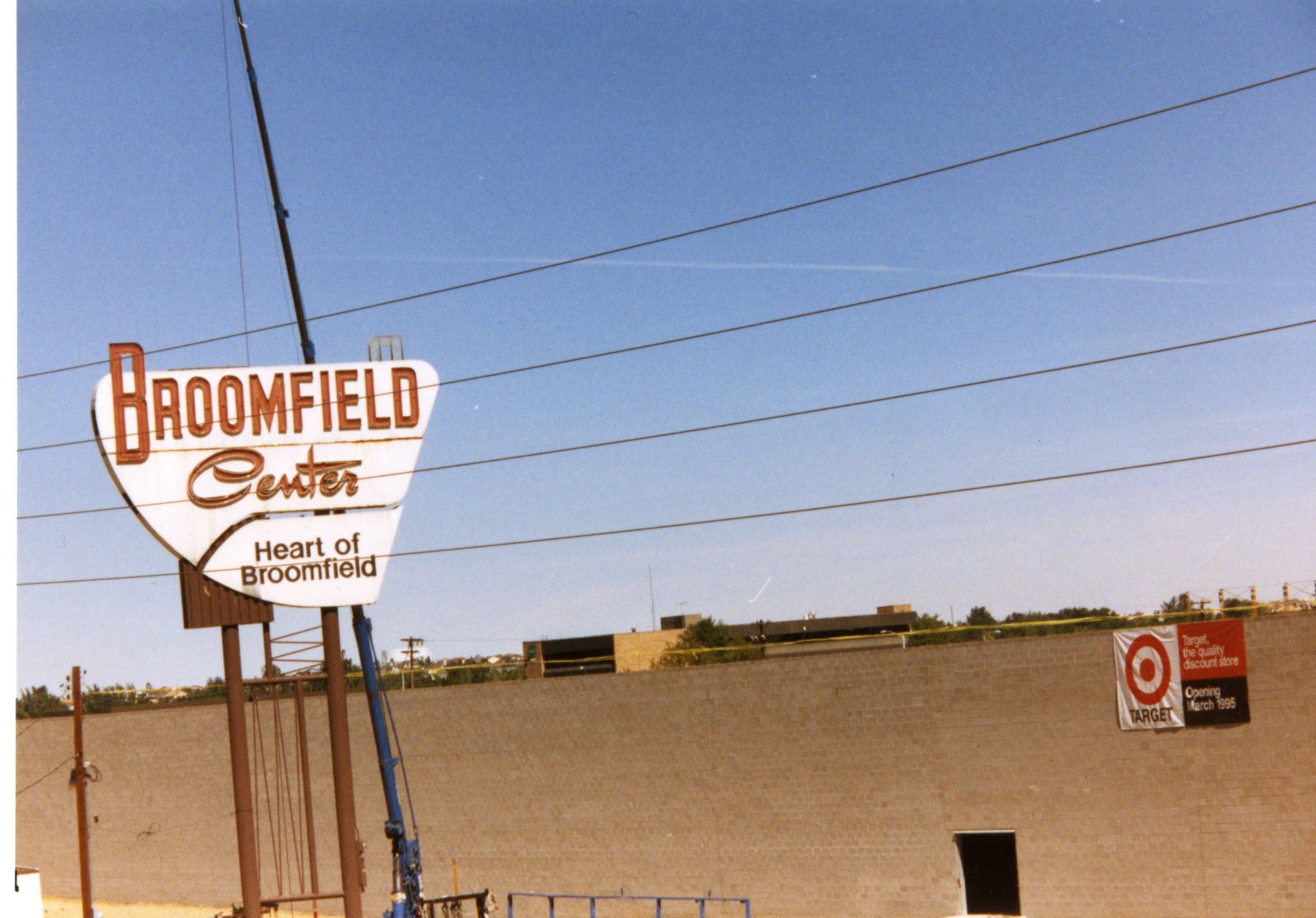 Broomfield Center sign / Heart of Broomfield sign being removed October 1994. Photo shows sign before being attached to crane. Target building in background with temporary sign "Opening March 1995." Sign was from the original shopping / strip mall on the site at the intersection of Midway, 287, and 36.Collection