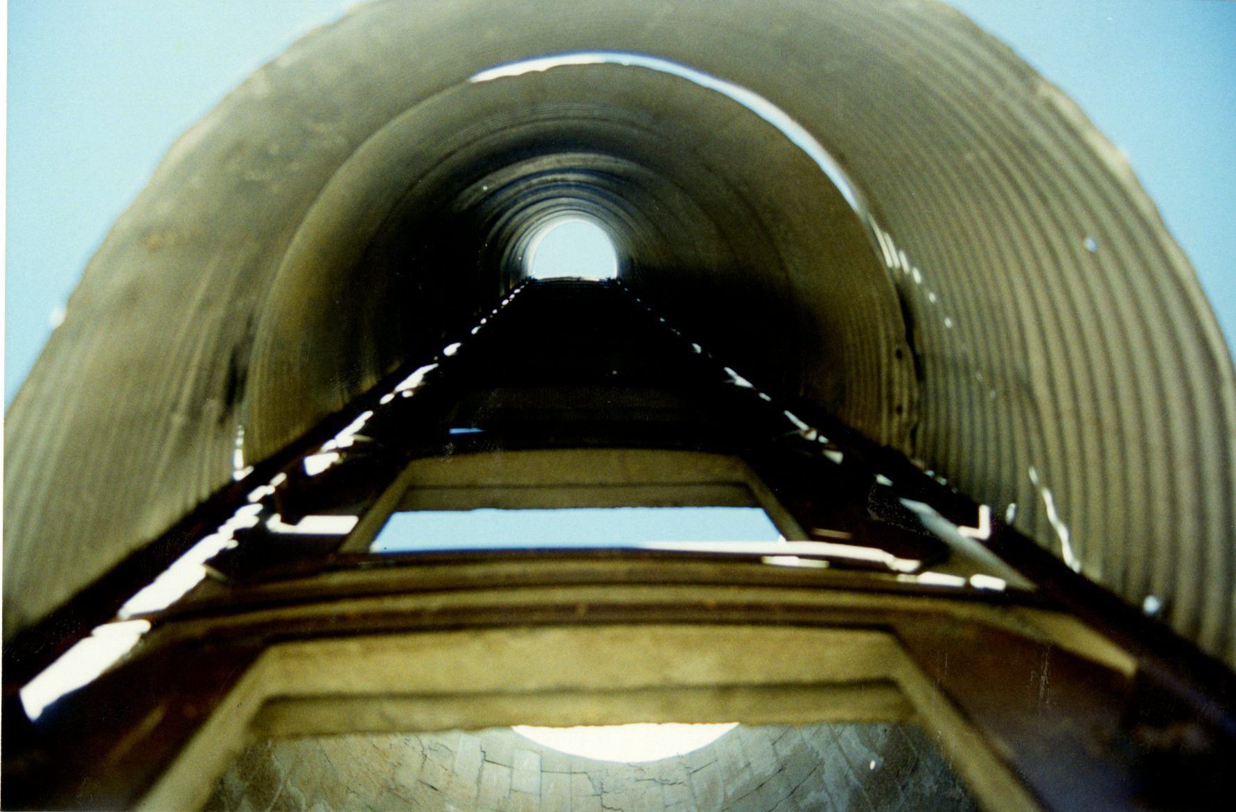 An inside of a silo with a ladder leading to the top.Photograph Details