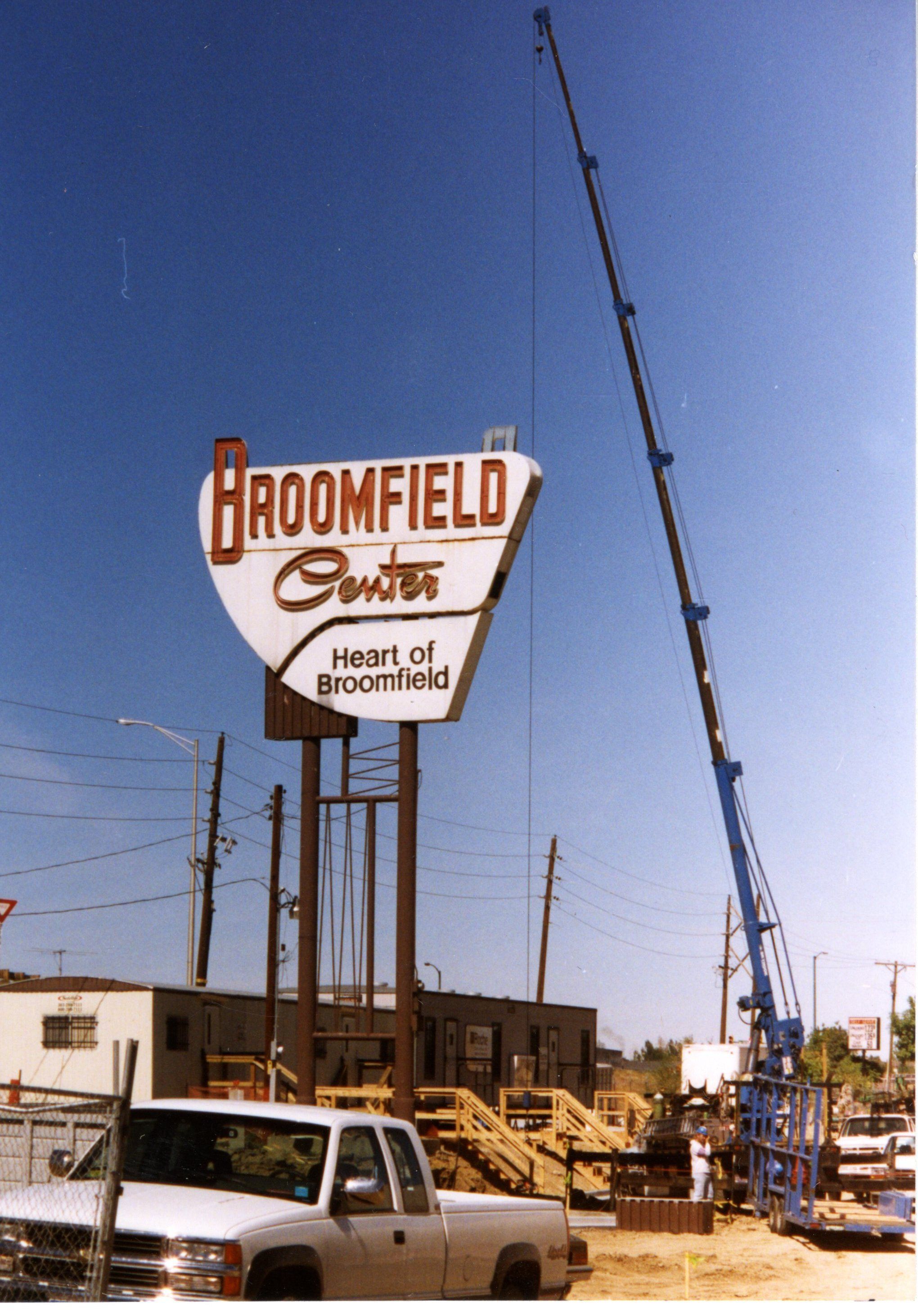Broomfield Center sign / Heart of Broomfield sign being removed October 1994. Photo shows sign before being attached to crane. Sign was from the original shopping / strip mall on the site at the intersection of Midway, 287, and 36.Collection