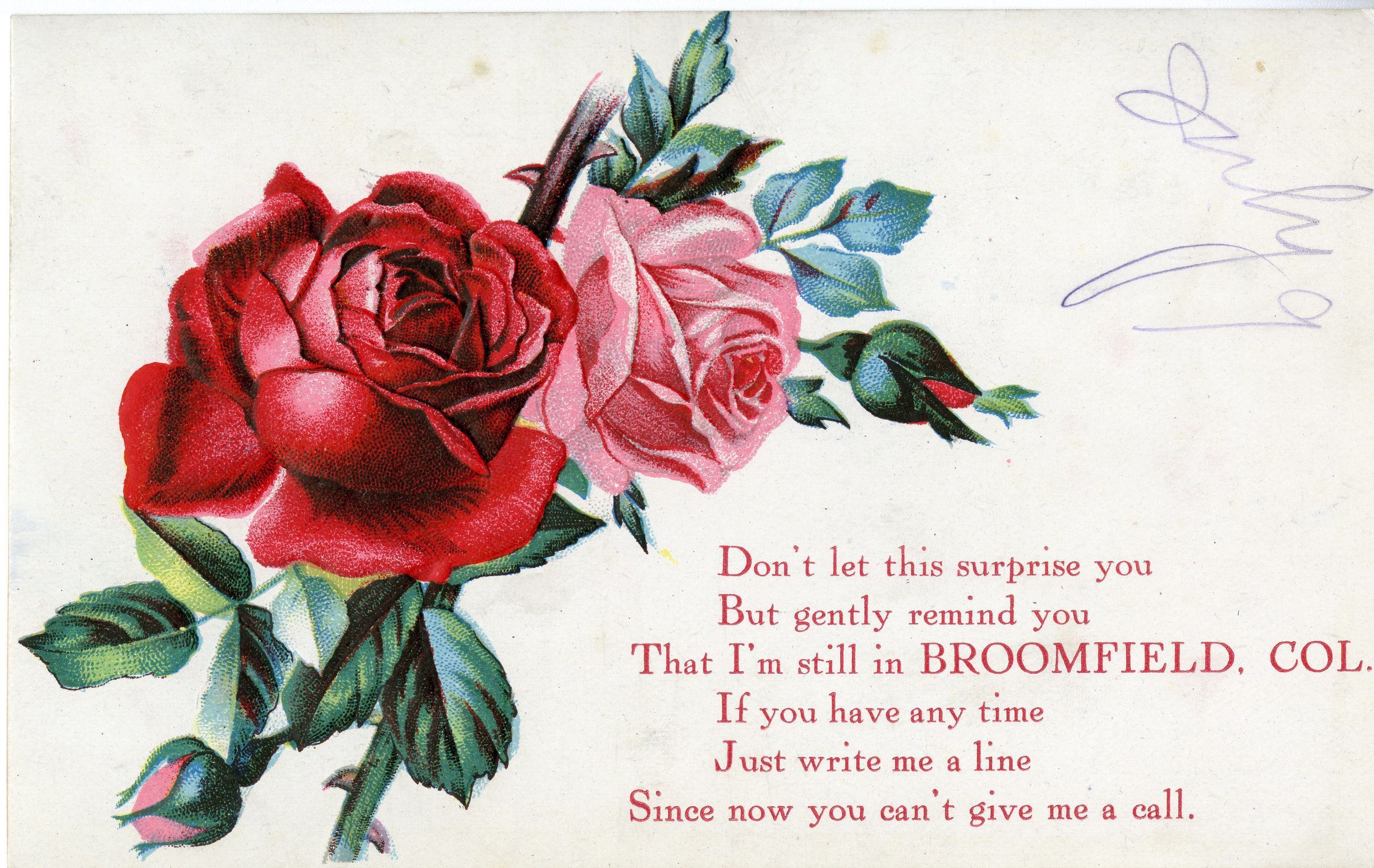 Souvenir postcard, likely a tradesman's sample mass-produced with every city's name, this one being for Broomfield. Early 20th century. Unused/never mailed. Front of postcard features a red and pink rose against a while background with a short poem in red ink: