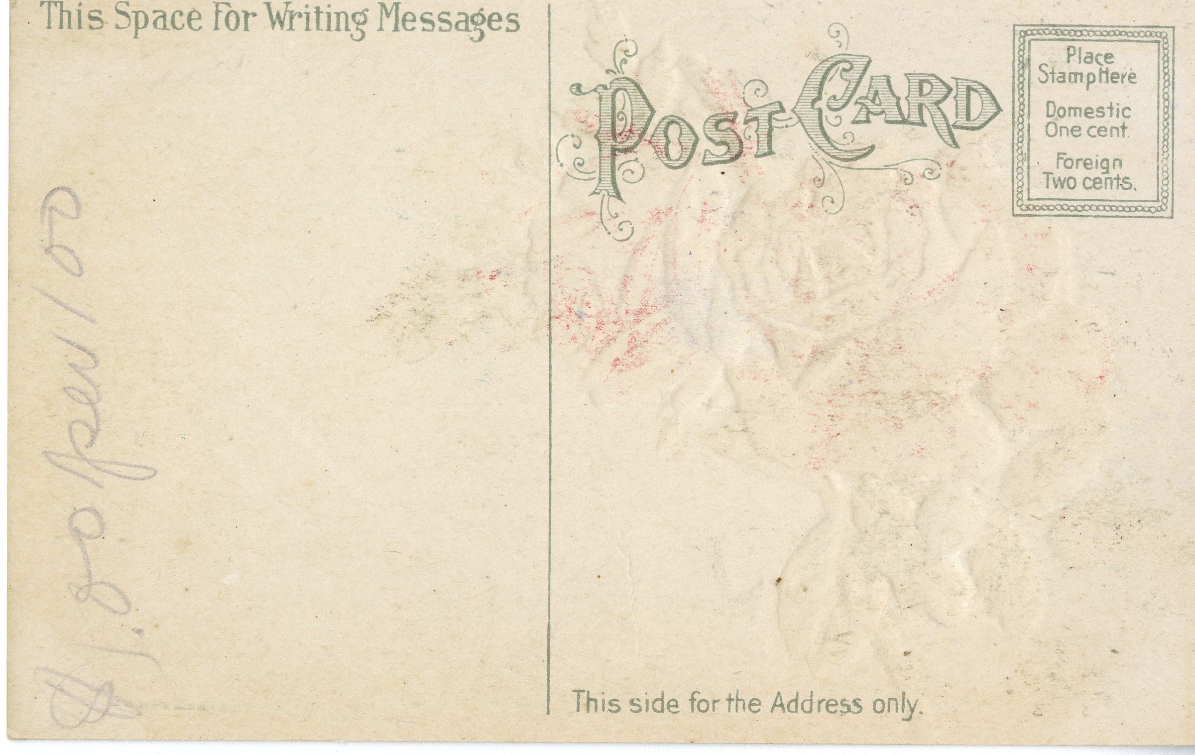 Reverse side is unused, although "$1 per 100" is scribbled in pencil along left edge. Printed in green ink is "This Space For Writing Messages" on left and "Post Card" on right. In the area where the stamp goes reads "Place Stamp Here / Domestic One Cent / Foreign Two Cents" - this price helps date the postcard to between 1898 and 1916 when it was 1 cent to mail a postcard. 1905-1915 has been described as an era of a "Postcard Craze."Collection
