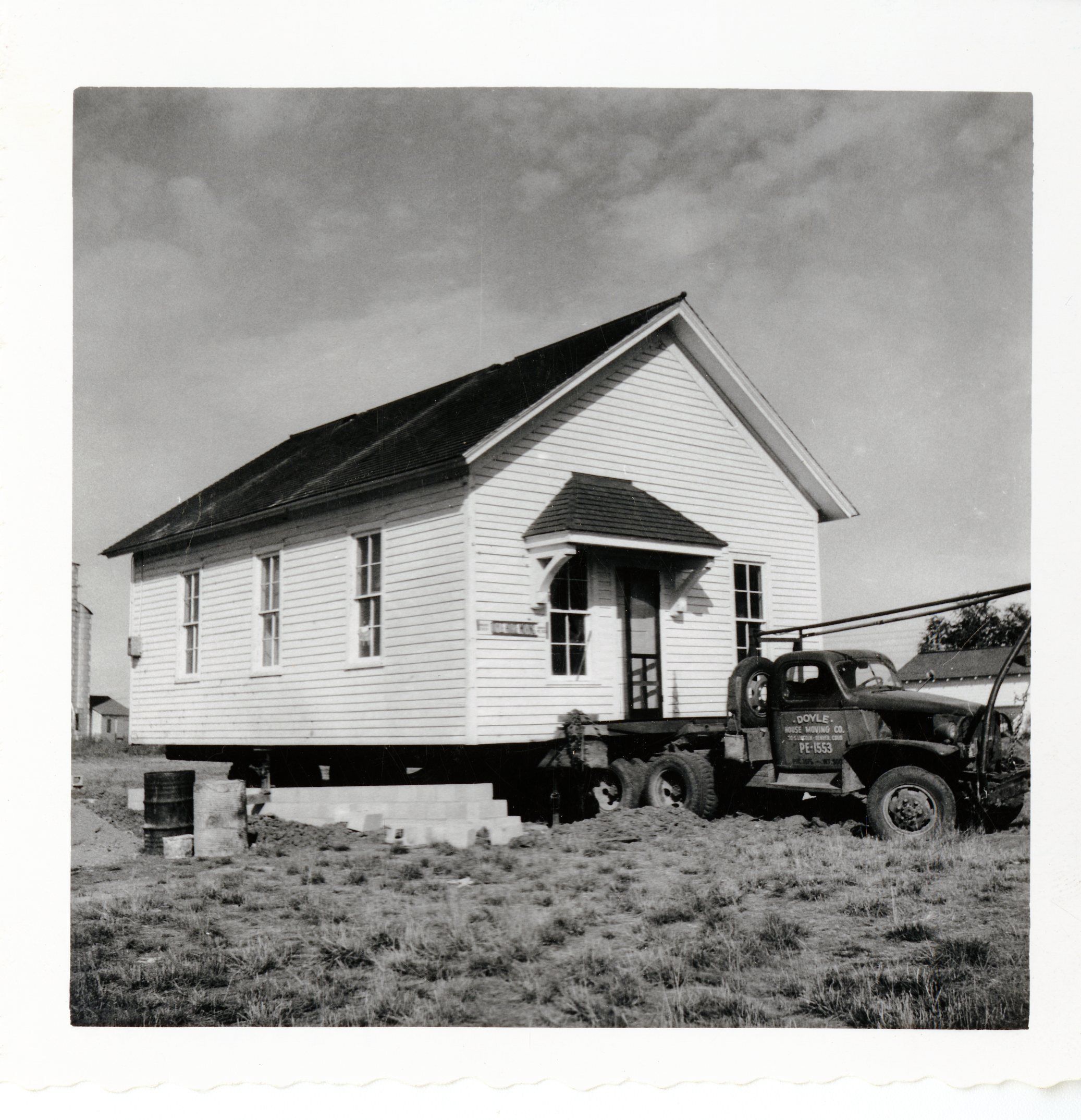 One room school house, the Broomfield School being moved. Miles Crawford moved this schoolhouse to 11975 Vance Street c. 1952. The building is lifted on stilts and is hitched to a pick-up truck with a logo for "DOYLE House Moving Company" on the side. The Coors grain elevator is visible in the background.