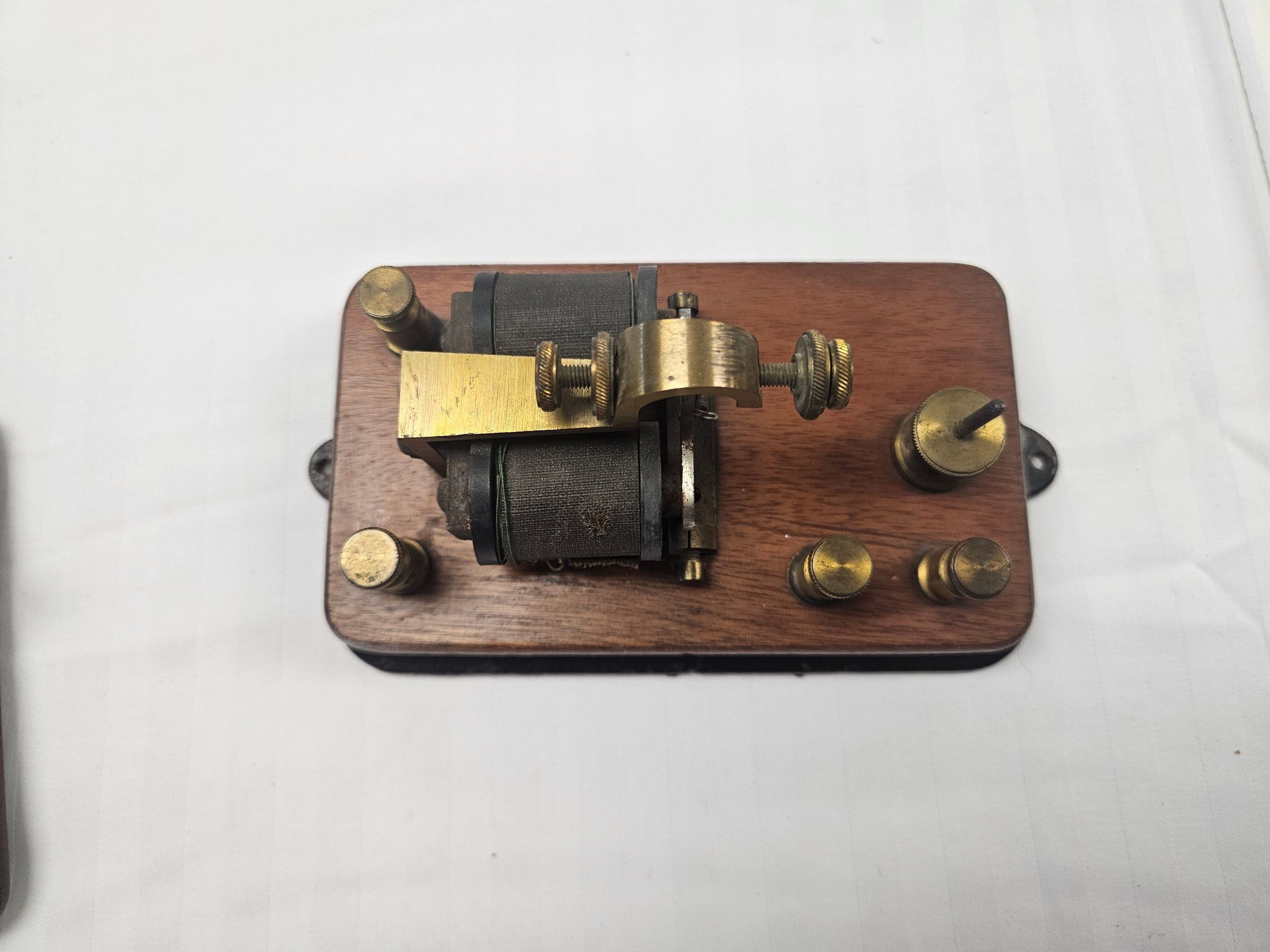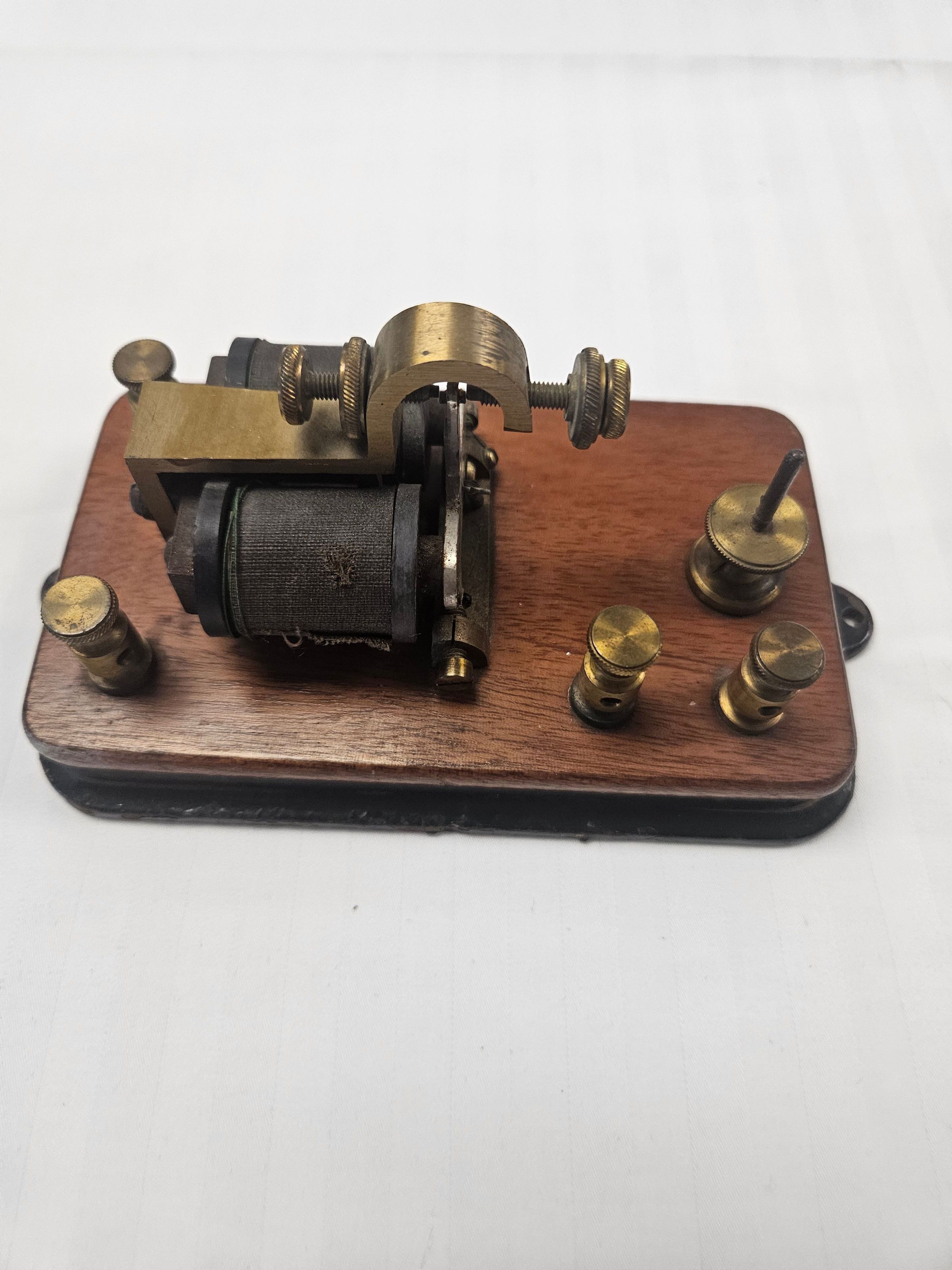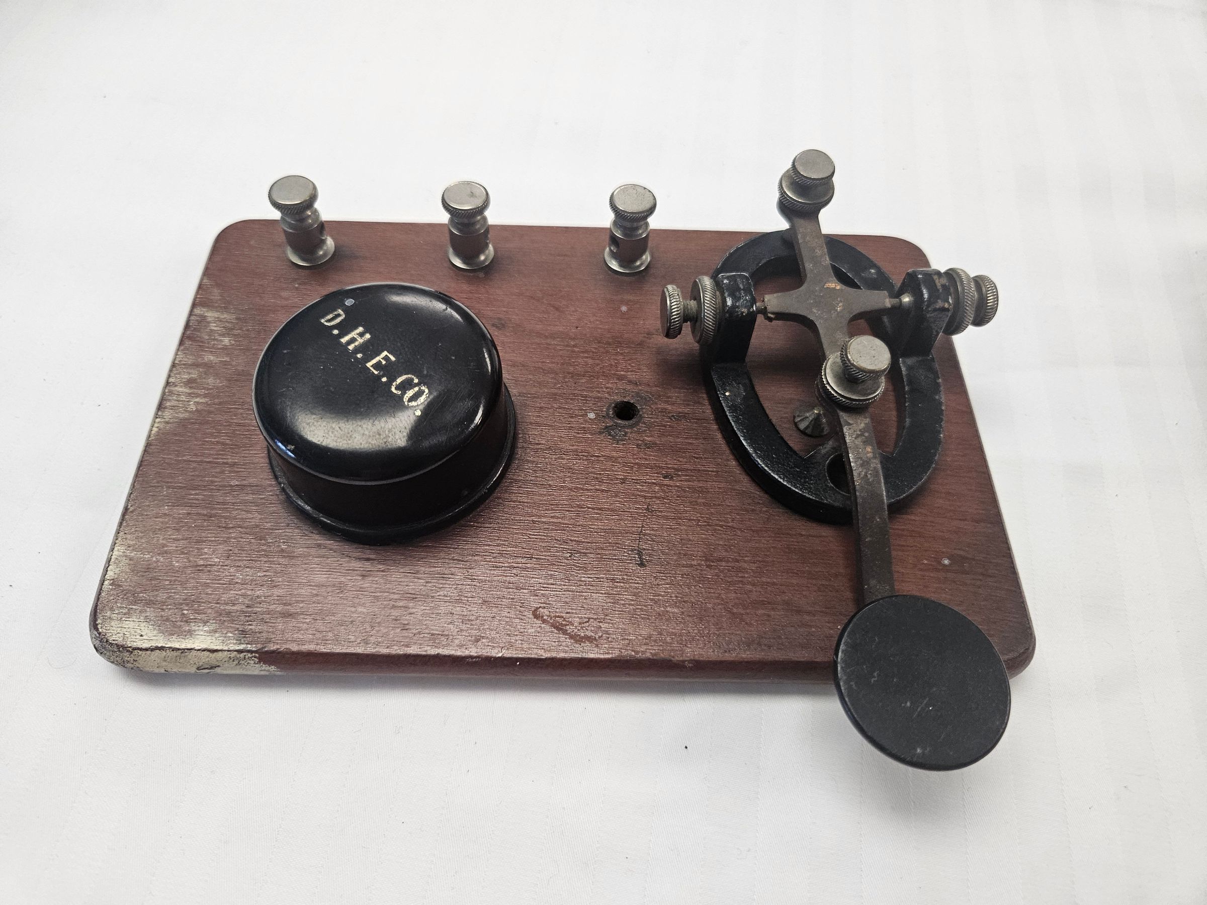 Item is an antique telegraph key and sounder. The two parts of the item are separate, each with a base made of both wood and metal. The telegraph key (a), which was used as an on-off switch to send electrical signals through a wire, has a metal knob and adjustment screws, and the painted black buzzer is labeled “D. H. E. CO.” The telegraph sounder (b), which was a device used to interpret the incoming electrical signals as Morse Code, is no longer connected by wires to the key and is made of metal and fabric components. Based on similar models, this item was most likely manufactured during the 1920-30s, but the exact date isn’t certain. There are corroded wires on the underside of each base, and the words “500 HMS” are carved into the base of the sounder.Lexicon