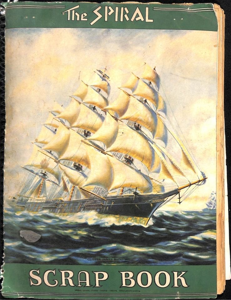 Item is a large spiral-bound scrapbook compiled by the Crescent Grange, an organization that served as a means of social gathering for early Broomfield residents. The cover of the book is titled "The Spiral Scrap Book" and features a detailed, colorful image of a sailing ship, titled the Clipper James Bain. The interior of the scrapbook is filled with memorabilia from the year 1939, including articles about the Crescent Grange, thank-you cards from people impacted by the group, and recordings of all the events the organization was involved in throughout the year.Collection