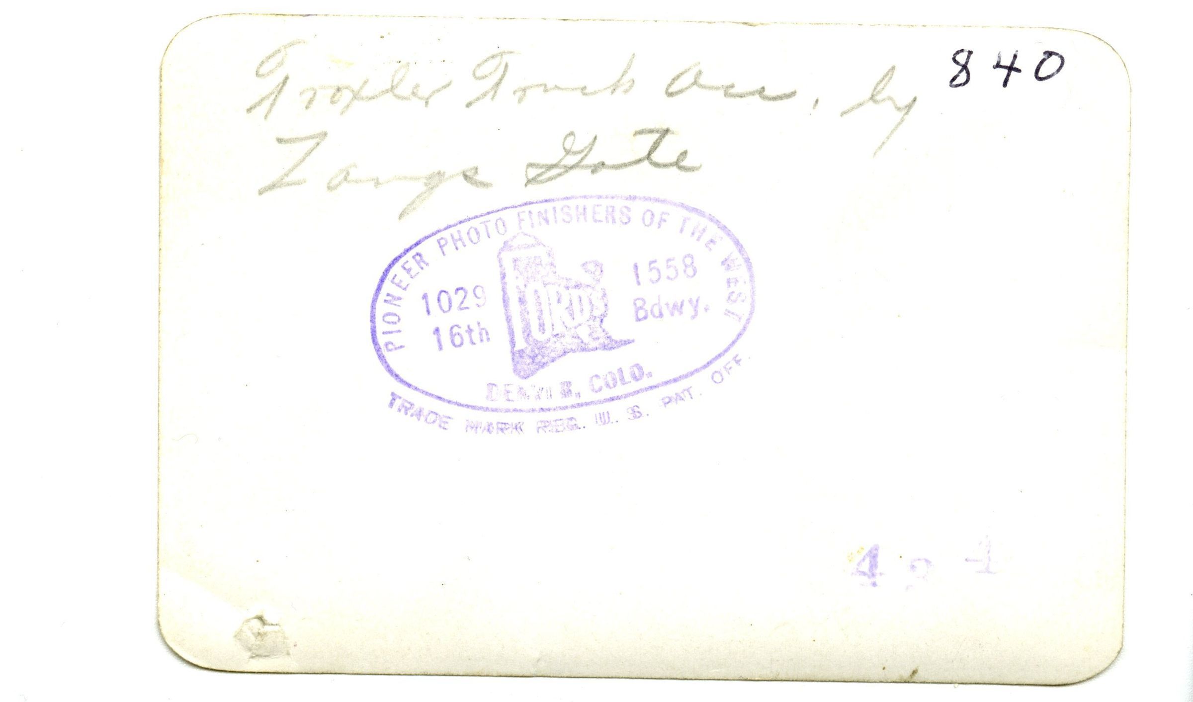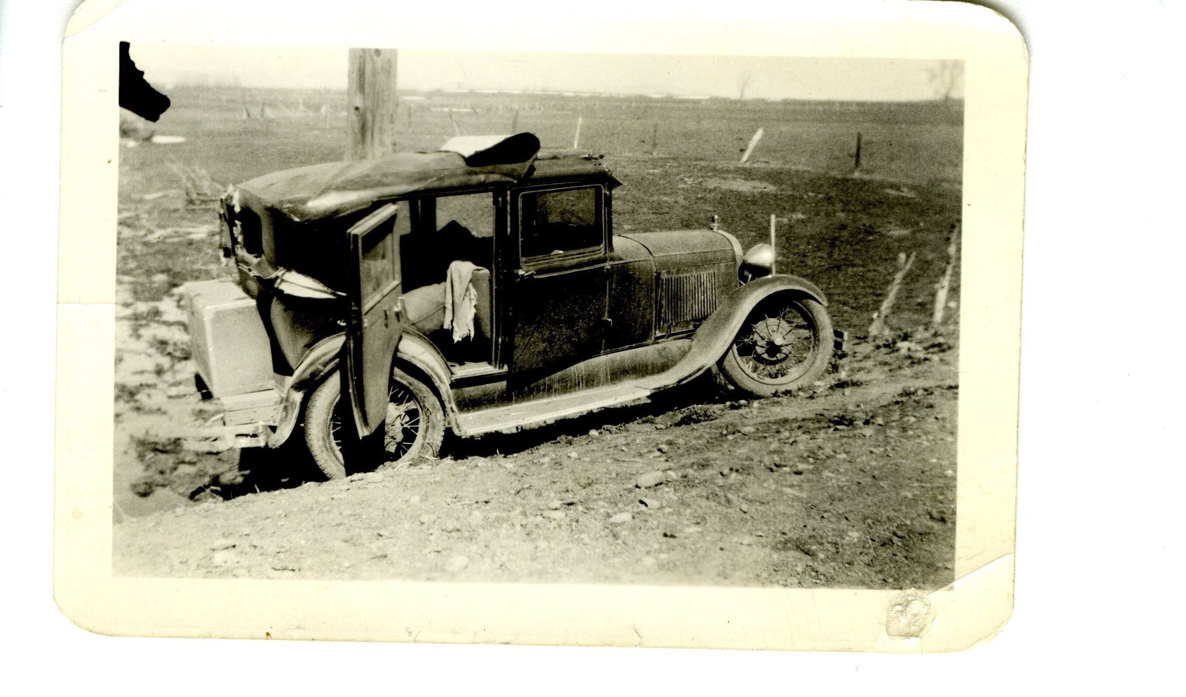 "Troxler" car by Zang Gate. Likely a Ford Model A or B, produced between 1928 and 1934. Dusty car with box on tailgate on back. Lower right tire appears to be stuck in the mud. Rear door is ajar, towel visible in back seat. Zang Ranch. Probably belonged to Troxler family, Broomfield. Photo produced by Ford's, Pioneer Photo Finishers of the West, Denver, CO. Stamped by producer "434".Collection