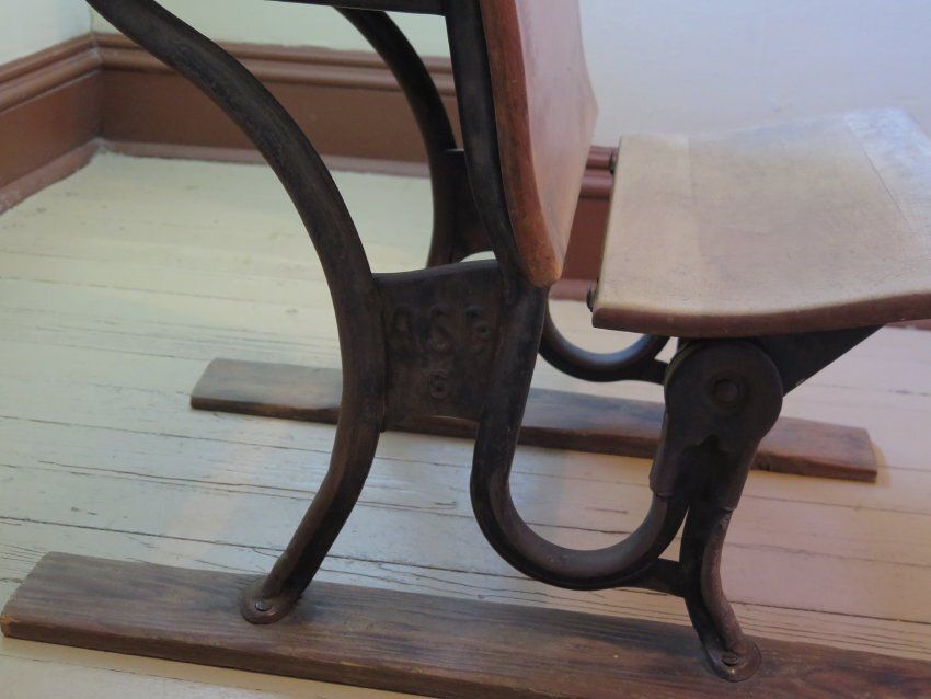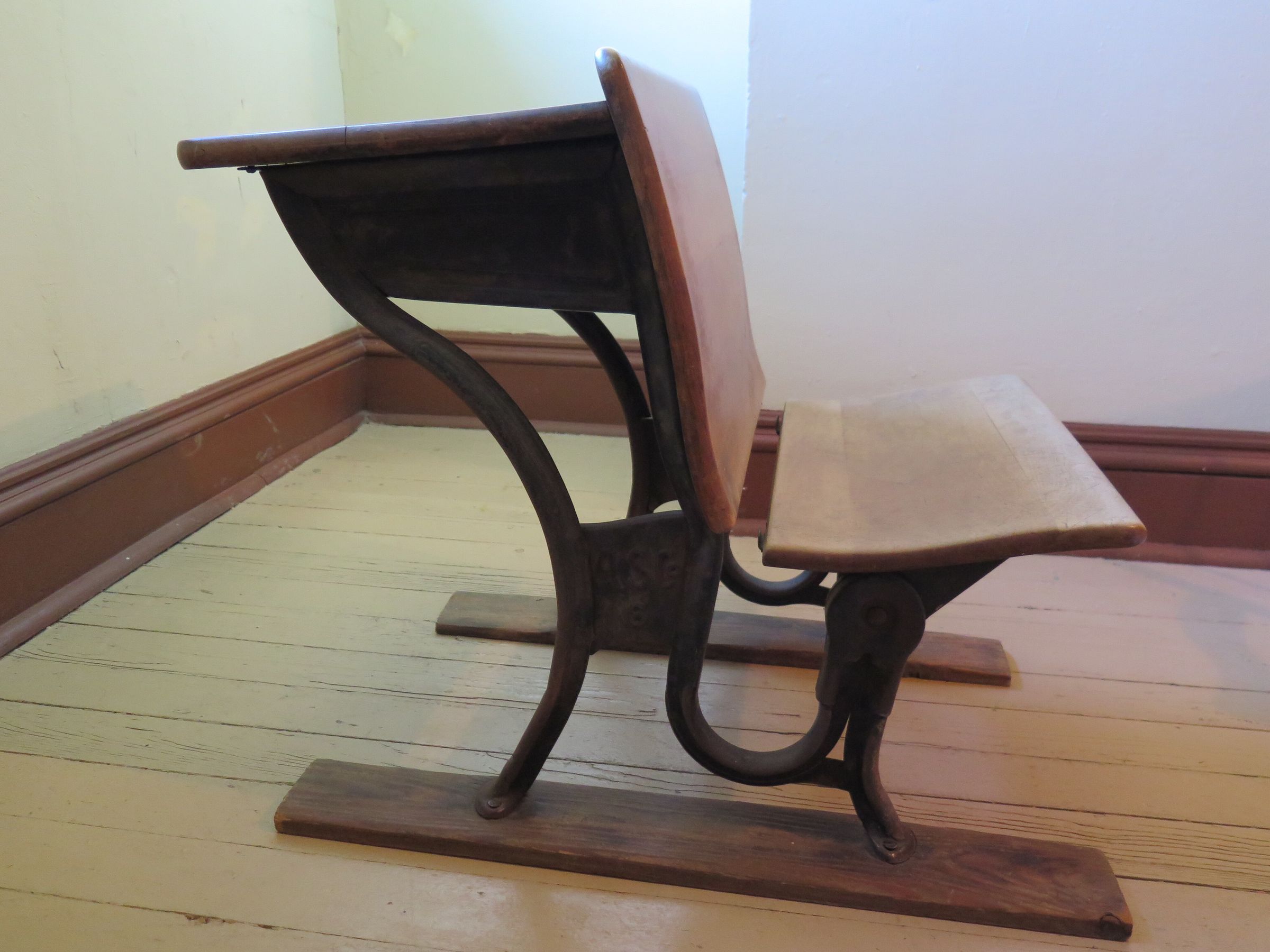 Wood and cast iron school desk with attached folding chair in front. The desk top has a storage compartment. The desk measures 23.5"(h) x 18"(w) x 25"(l).