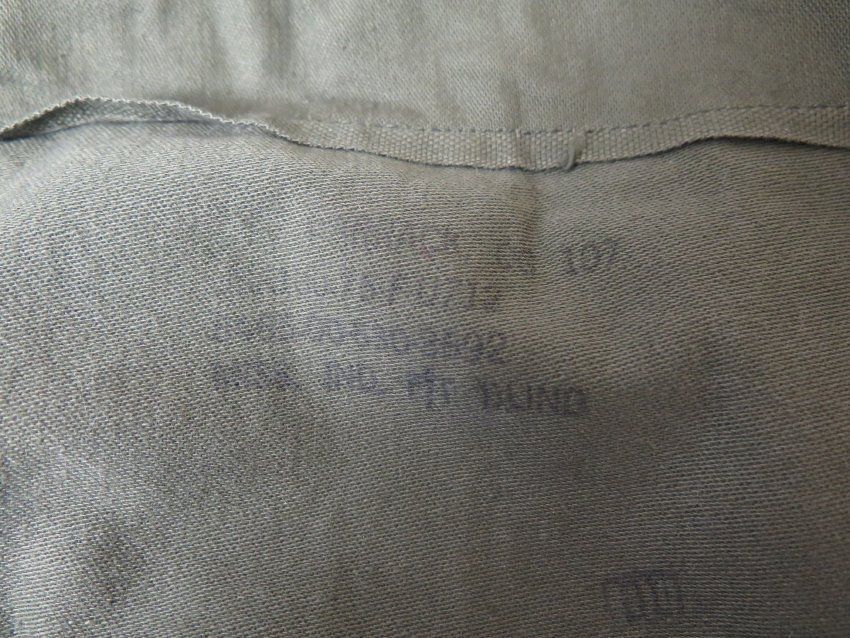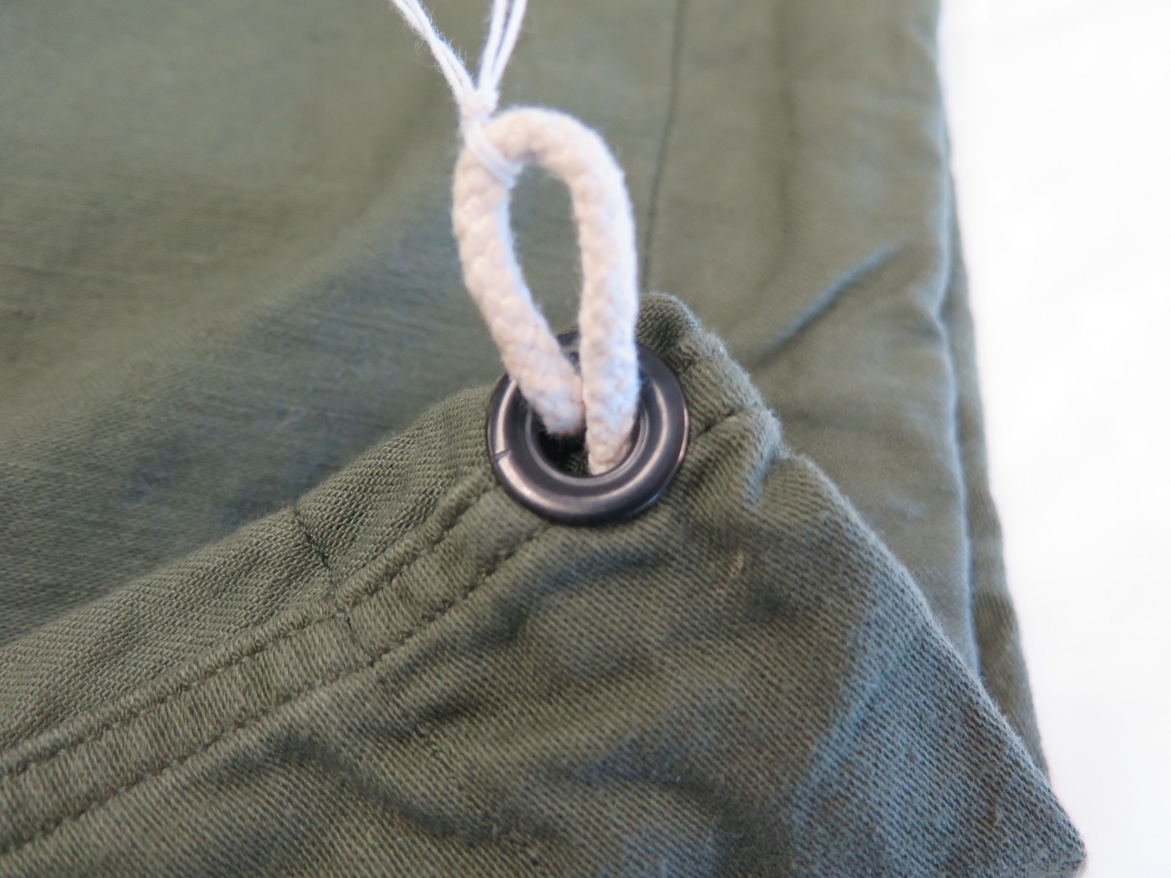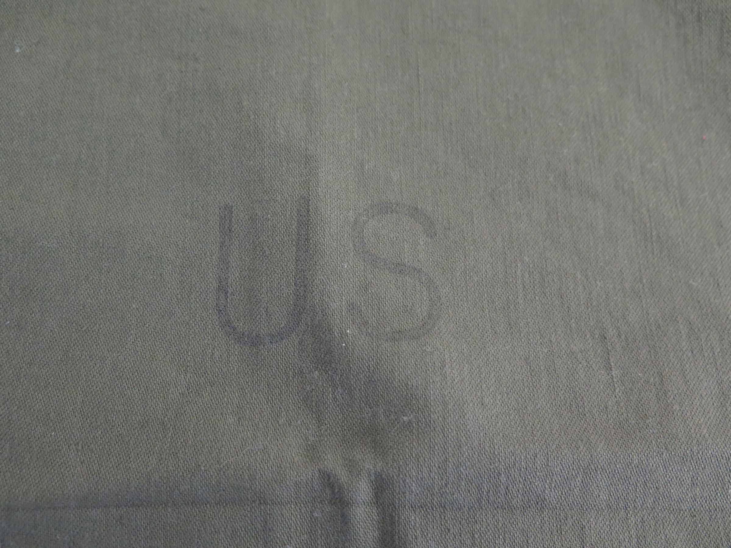 This is a olive drab World War II barrack bag with tie string and metal grommets. The Barrack/Laundry Bag was used by military personnel as a general purpose bag. The stamp on the bag reads, "Bag, Barrack, OG107". There is more text under this, but it is very hard to read. The bag measures 30" (h) x 23.5"(w).