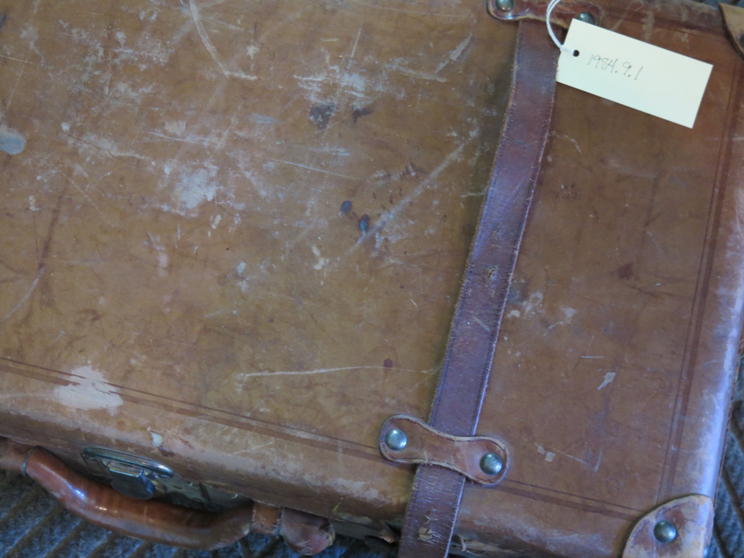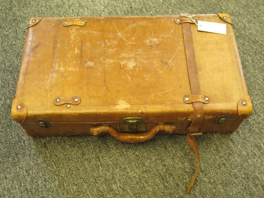 This is a brown leather suitcase with a metal latch on the top. There are broken leather straps on either side of the leather handle. There is a pair of lathes of either side of the straps. The suitcase measures 13" (h) x 24" (w) x 6.25" (d).